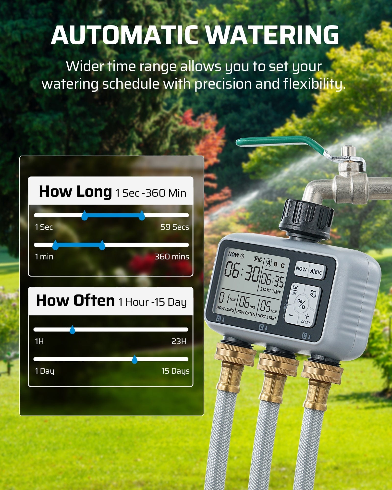 【3 Independent Zones】Our faucet timer offers individual control over 3 zones (A, B, C), enabling tailored adjustments for start times, watering durations (1 second to 360 minutes), and watering frequencies (every 1 hour to 15 days); ensures optimal watering schedules for gardens, yards and lawns