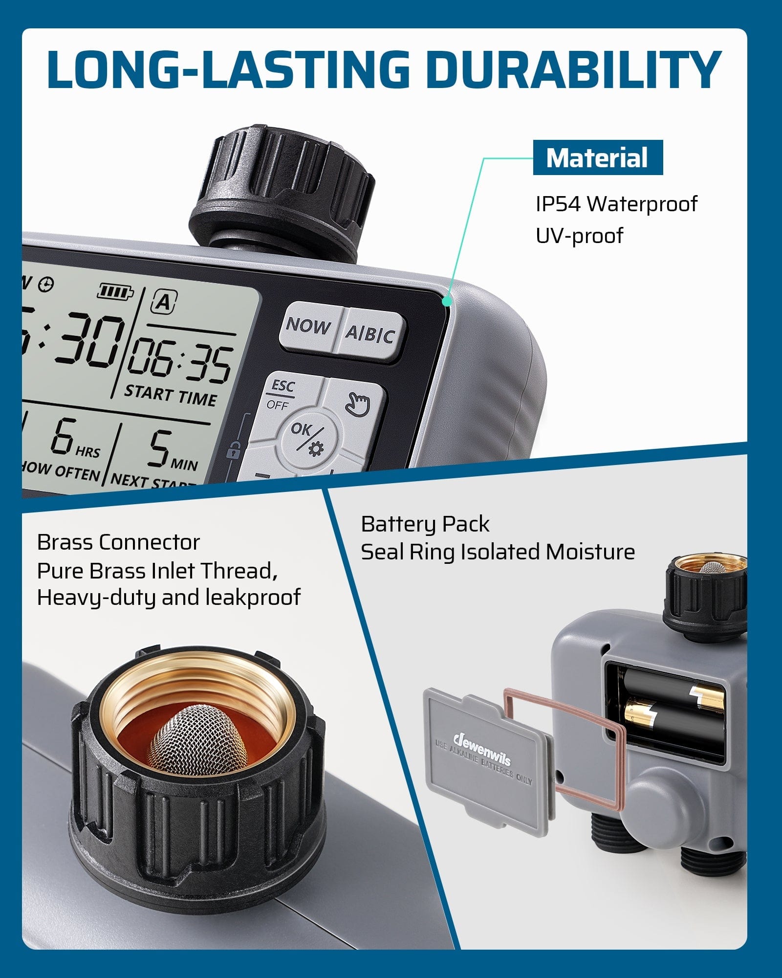 【Dependable & Watertight】Crafted from durable brass at the inlet and included adhesive tape (you can wrap around the faucet) ensure a snug connection with the sprinkler timer; this setup preserves water pressure unaffectedly, enduring pressures of up to 120 psi; sun-resistant ABS plastic shell and IP54 waterproof rating are ideal for outdoor applications