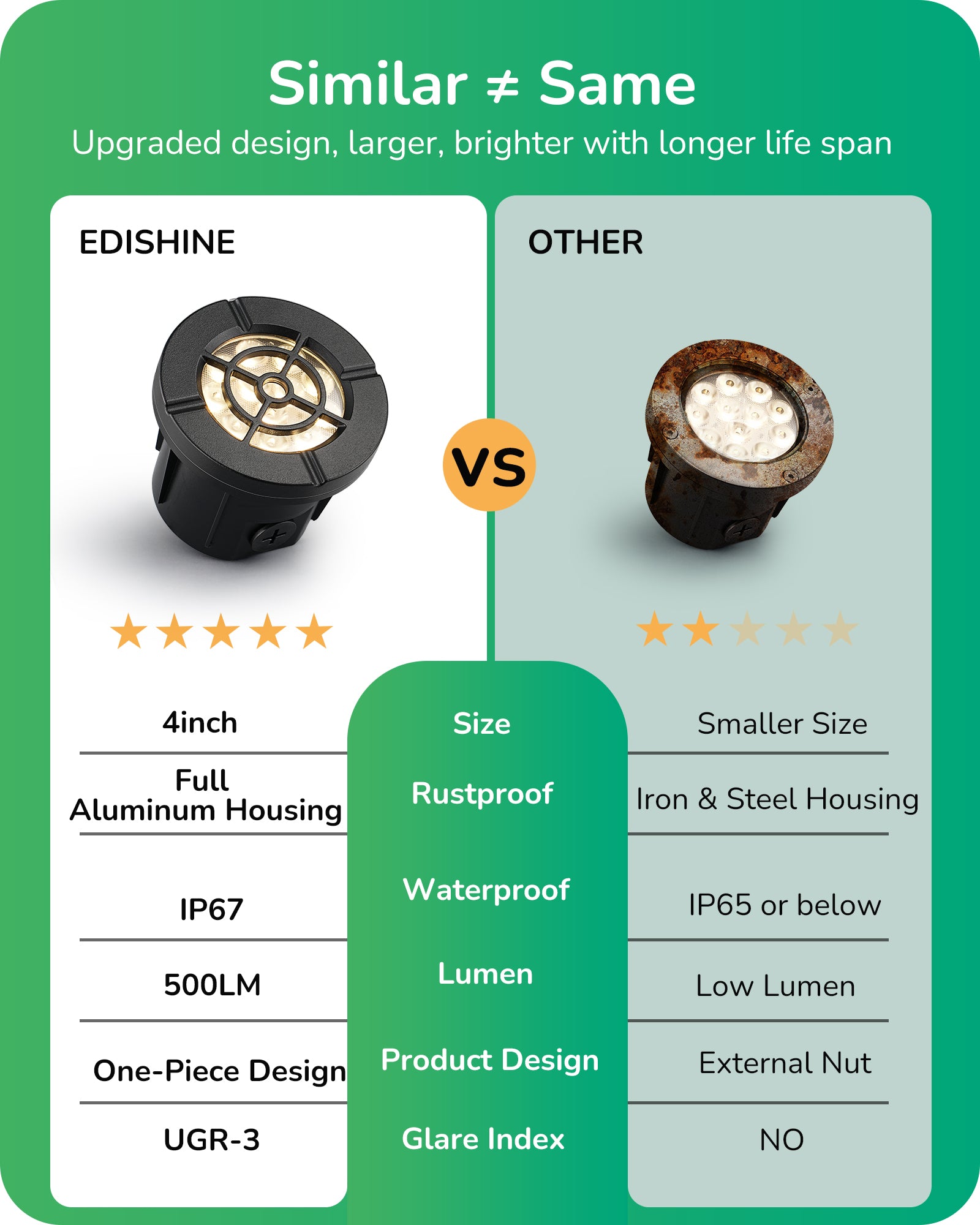 【Superior Quality Components】Our in-ground lights feature advanced clear convex lenses for increased brightness; energy-saving LED chips provide up to 600LM brightness using only 8W, lifespan of up to 50,000 hours for long-lasting use; UGR-19 glare index ensures scientific protection for human eye health