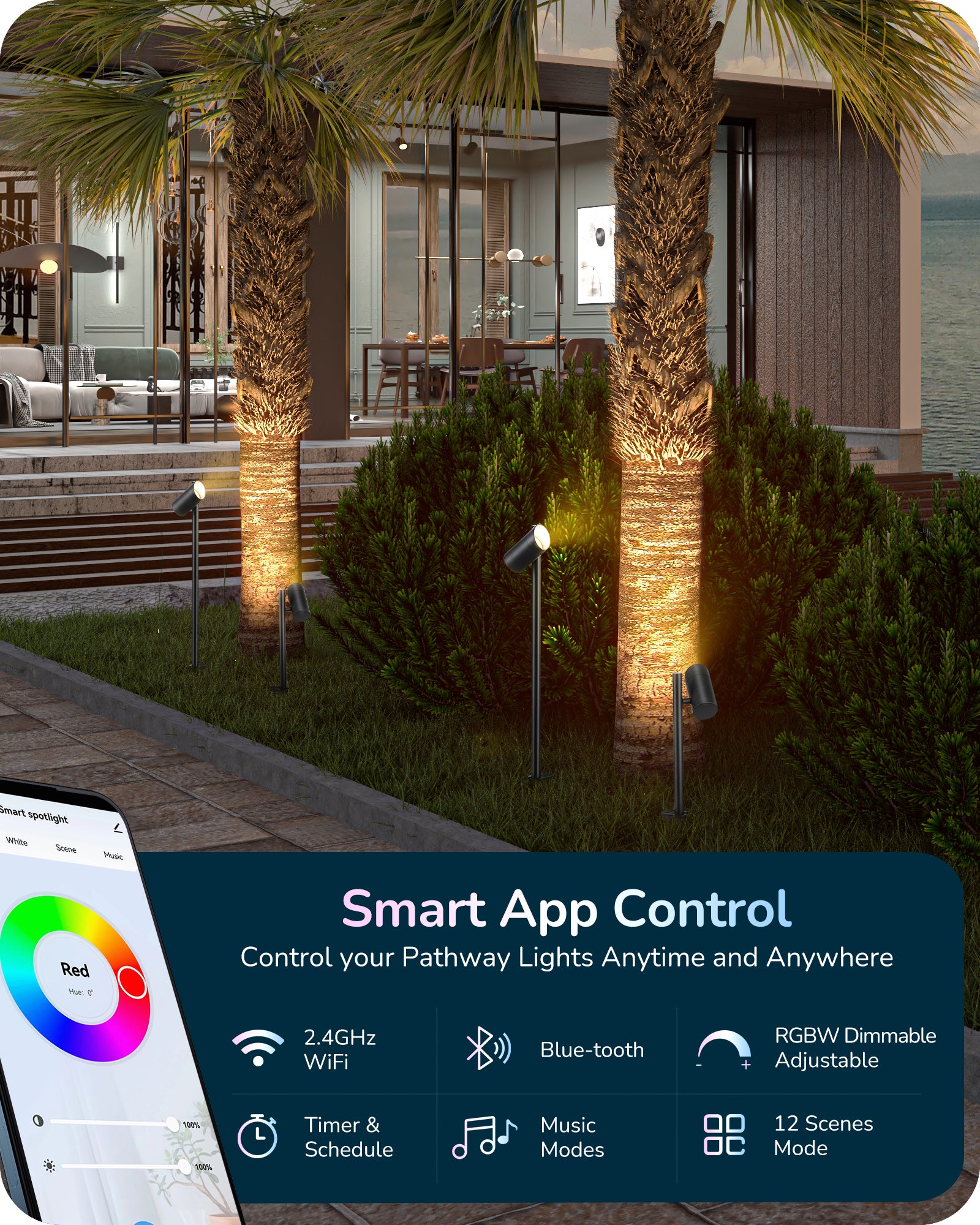 【12 Scenes Mode & Sync with Music】Equipped with 12 pre-set scenes for desired lighting effects whether a tranquil or a vibrant party atmosphere; music sync mode synchronizes lighting with your favorite tunes; with timer function, you can set automatic on/off times to easily manage smart low voltage pathway lights