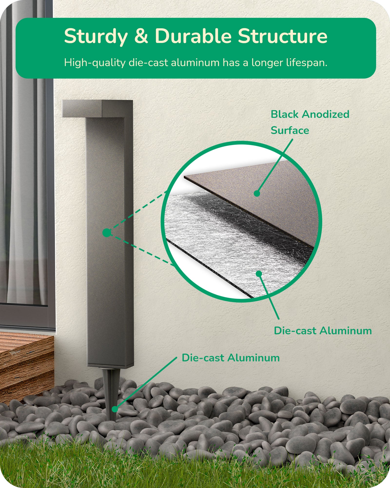 【Sturdy & Weather-Resistant】Crafted from robust die-cast aluminum, this outdoor landscape light features an IPX5 waterproof and corrosion-resistant rating; reliable in any weather condition, ranging from -40°F to 140°F; with a lifespan of 50,000 hours, the LED beads significantly reduce electricity costs by over 88%