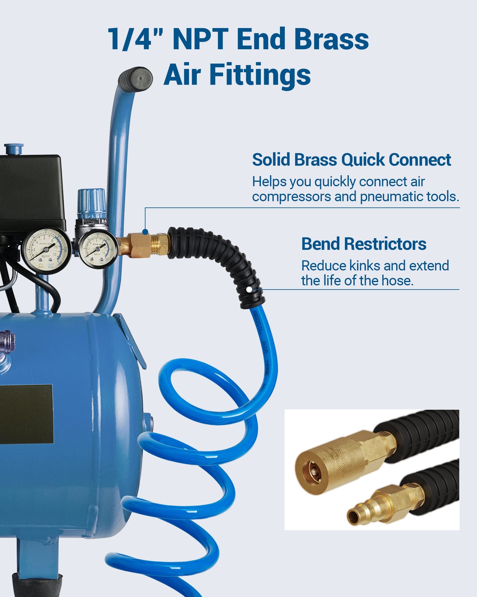 Include a 1/4" NPT brass coupling and an I/M steel plug to help you quickly connect your air compressor to your air tools. The bend restrictor reduces kinks and extends the life of the hose.