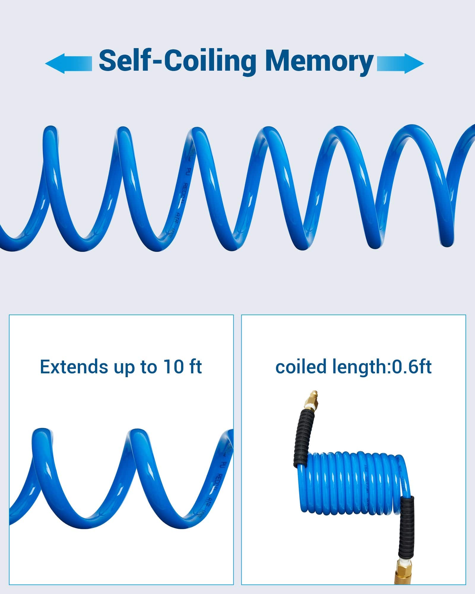 【High Strength Polyurethane】Crafted from high-quality pure polyurethane, our auto-rebound air hose offers superior flexibility and lightweight construction; Its anti-kink, oil, abrasion, and corrosion-resistant properties ensure long-lasting durability in demanding work environments; vibrant blue color makes it easily identifiable even in busy work sites