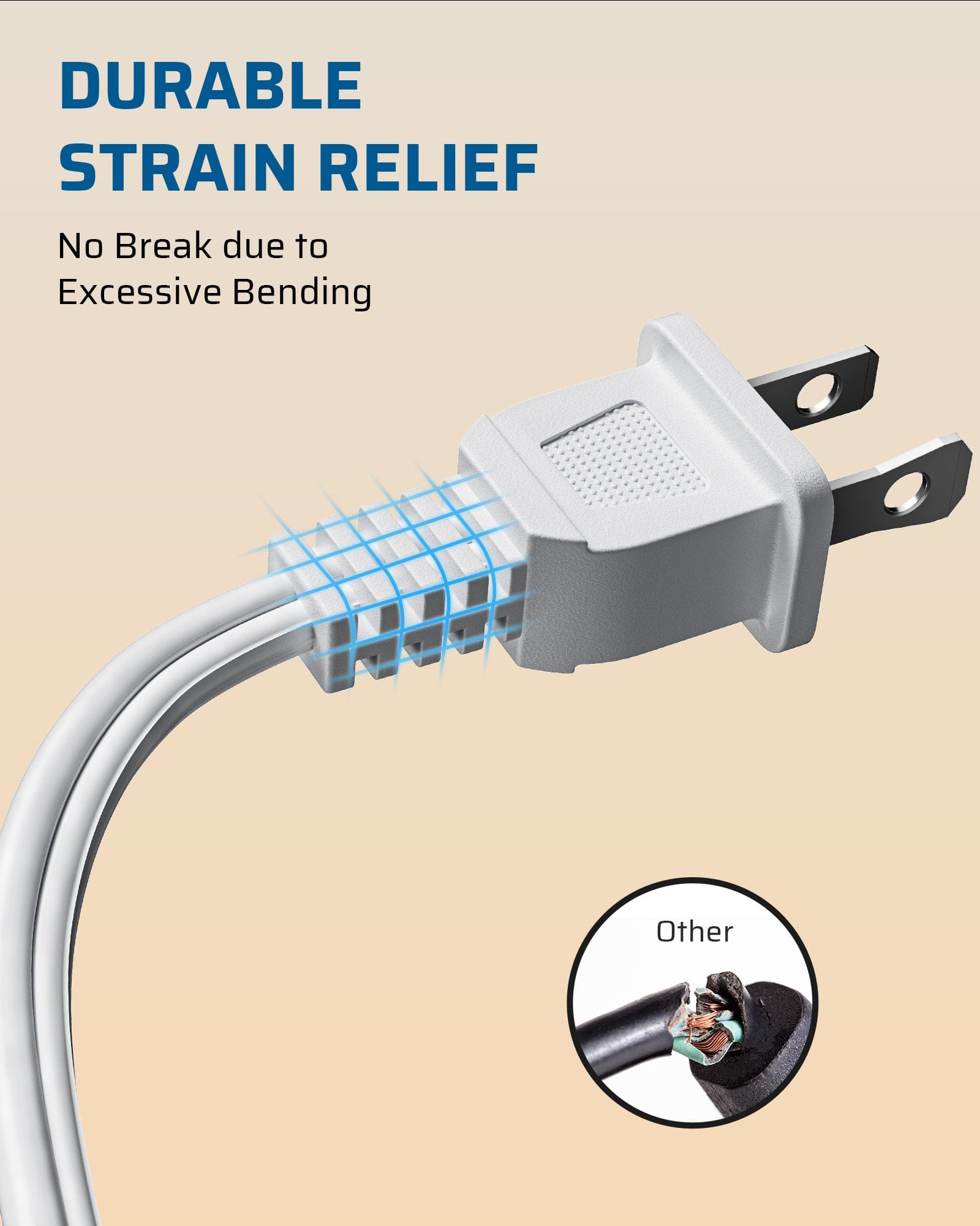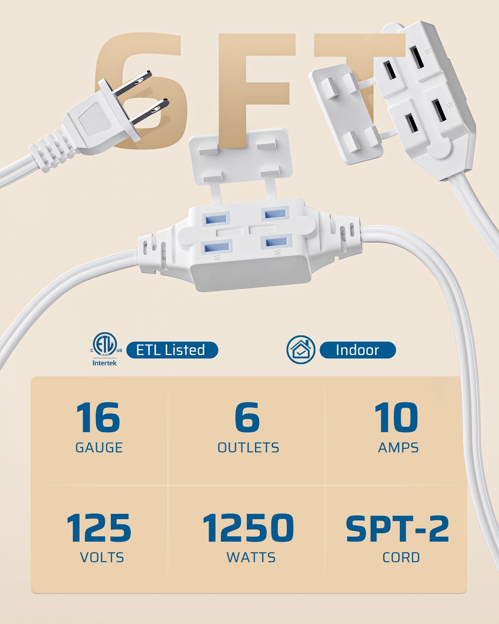 【3 in 1 Outlet】This 6ft extension cord features 2 groups of outlets: 3ft from the plug to the first set of sockets, and another 3ft to the second set; each group includes three 2-prong outlets, offering a total of 6 sockets to power multiple low-wattage devices for improved efficiency
