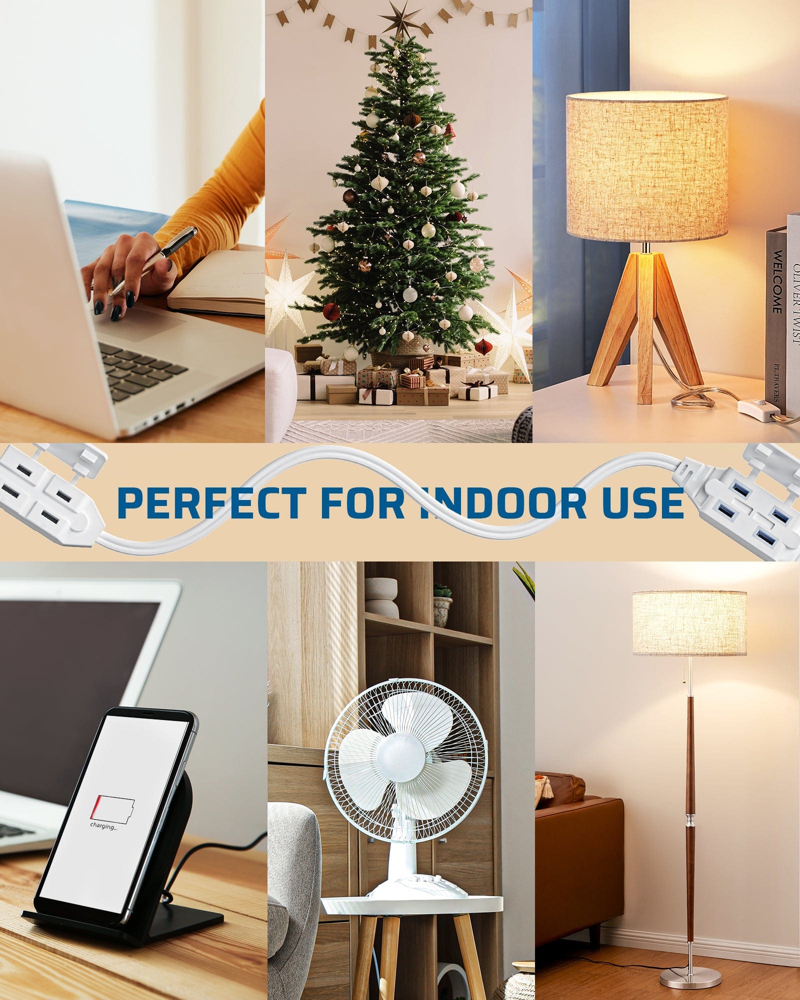【Versatile Indoor Use】With a 16 AWG power cord supporting up to 10A, 1250W, this extension cord is ideal for home and office; extend short lamp cords to outlets behind furniture or connect temporary holiday lights, perfect for powering table lamps, tablet PC, fan, and festive lighting