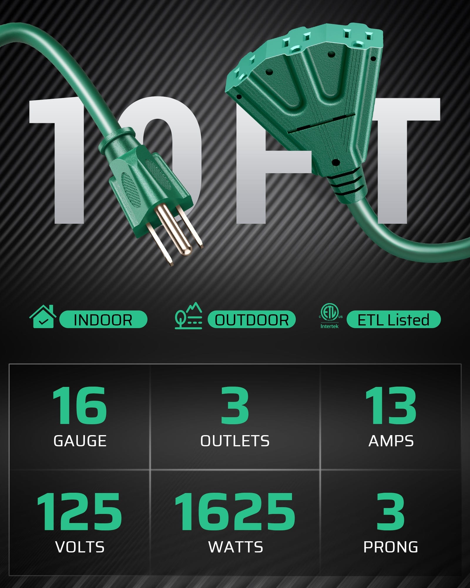 【 16/3 Gauge SJTW Extension Cord 】 This extension cord is AC 125V/13A/1625W power rated, making it compatible with most household appliances. The green jacket allows it to blend seamlessly into your exterior landscape. It's perfect for powering outdoor lighting, Christmas lights, seasonal decorations, lawn care equipment, and snow removal equipment.