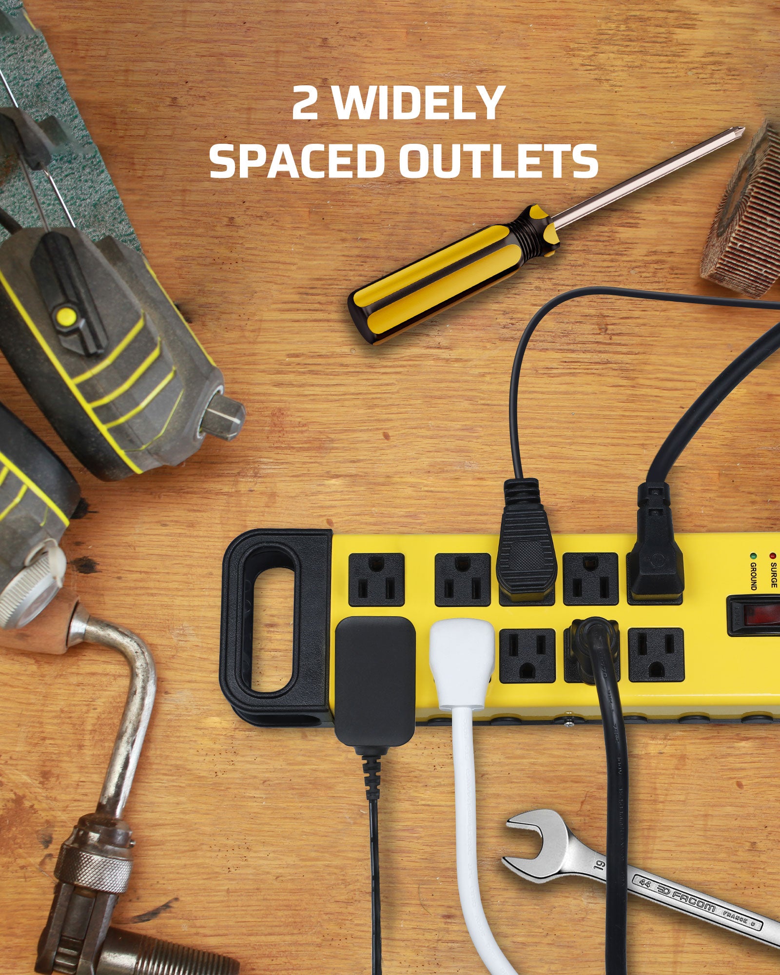 【10-Outlet Industrial Power Strip】 This power strip features 10 grounded AC outlets (15A/120V/1800W), providing multiple outlets to meet your power needs at the same time. Additionally, it includes 2 spaced-out outlets to accommodate larger plugs.