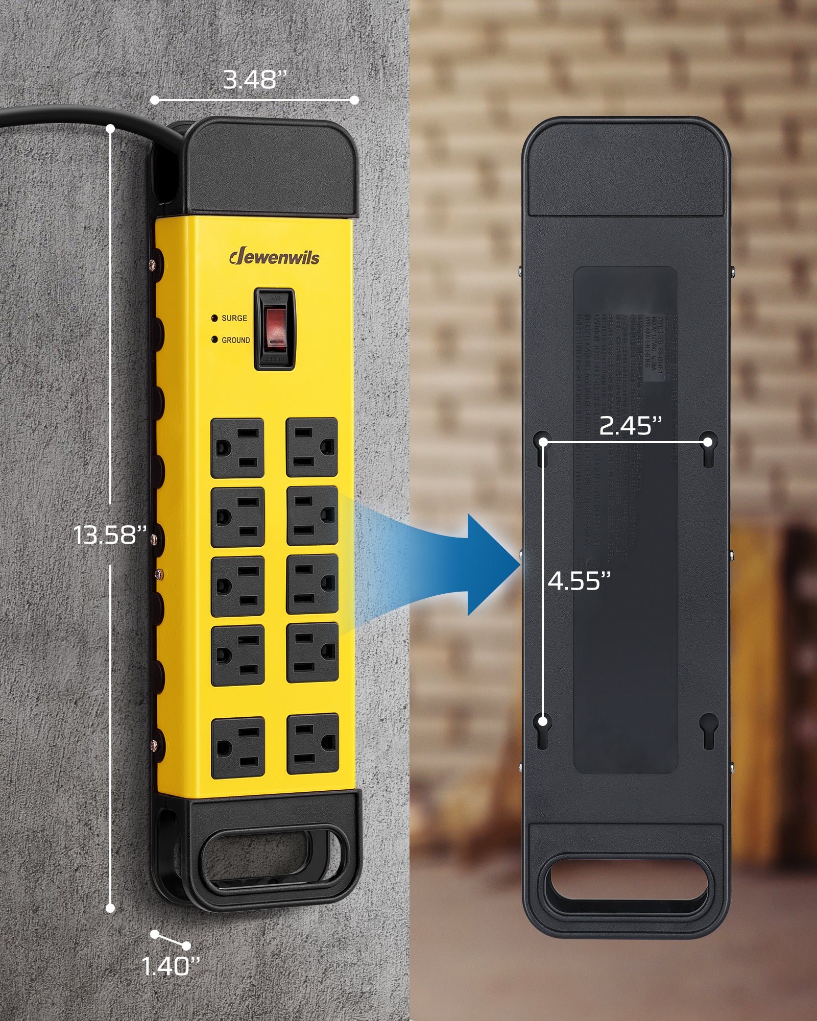 DEWENWILS 10-Outlet Metal Surge Protector Power Strip with 15Ft Cord, Flat Plug, 15A Circuit Breaker, 1440Joules for Garage, Workshop, Wall Mountable-HOU100B