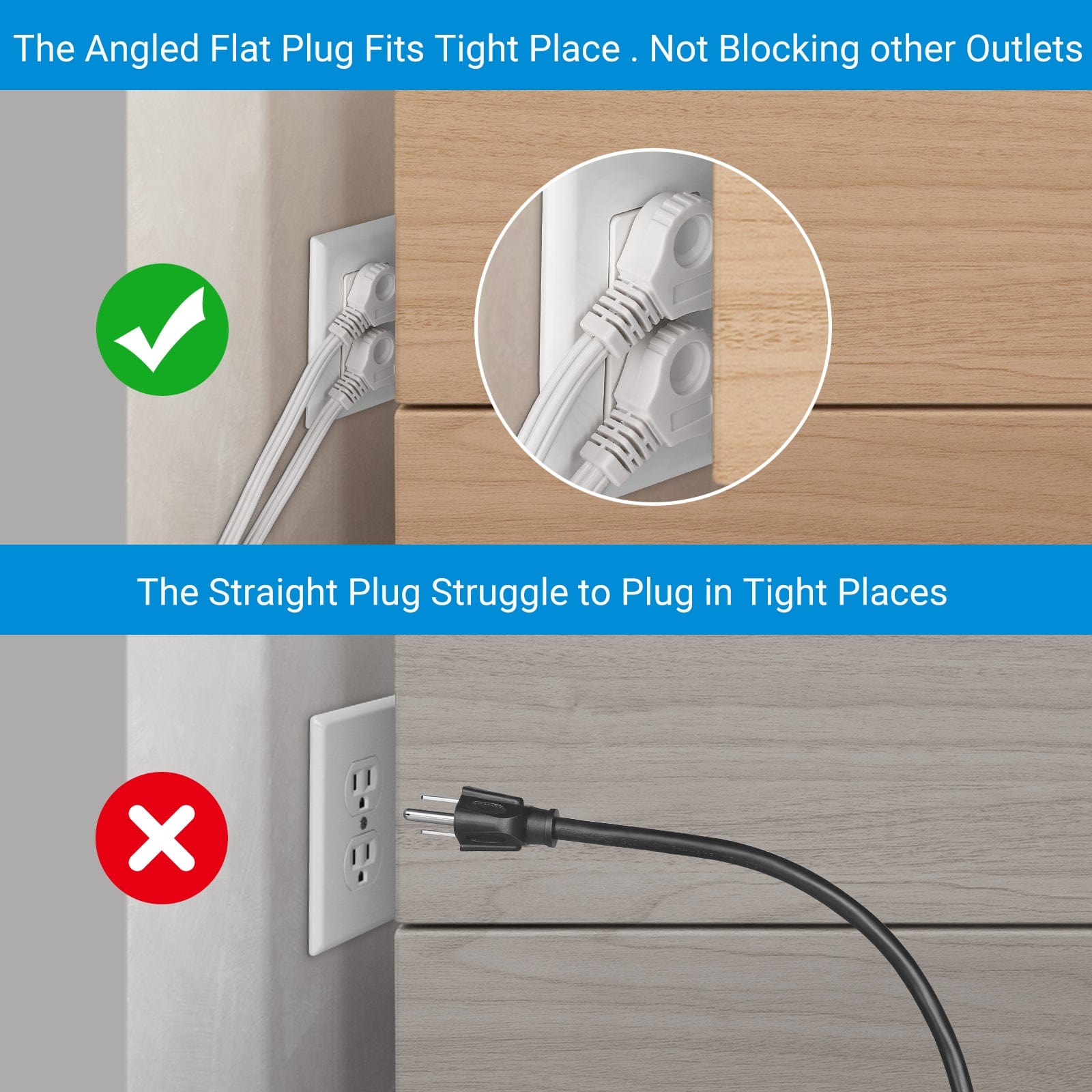 Angled Flat Plug - the extension cord comes with 45°low profile plug, perfect for plugging in the outlet without blocking the other one