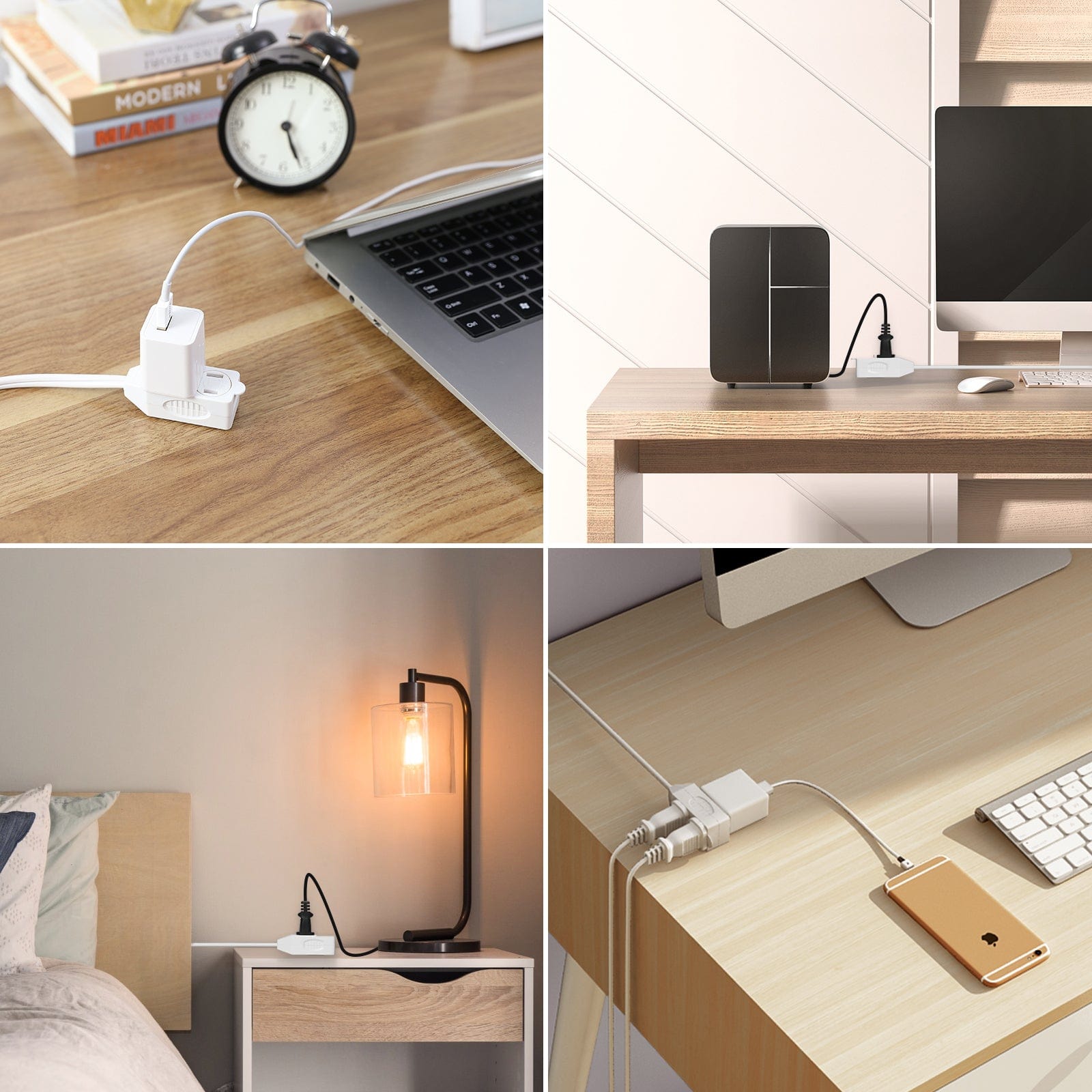 【12FT Twin Extension Cord】This extension cord comes with two 6ft cords from the splitter in the middle, making it perfect for powering appliances on either side of your couch or bed. Use it to plug in your clock, USB adapters, lamps, night lights, baby monitors, chargers, or other electric gadgets.