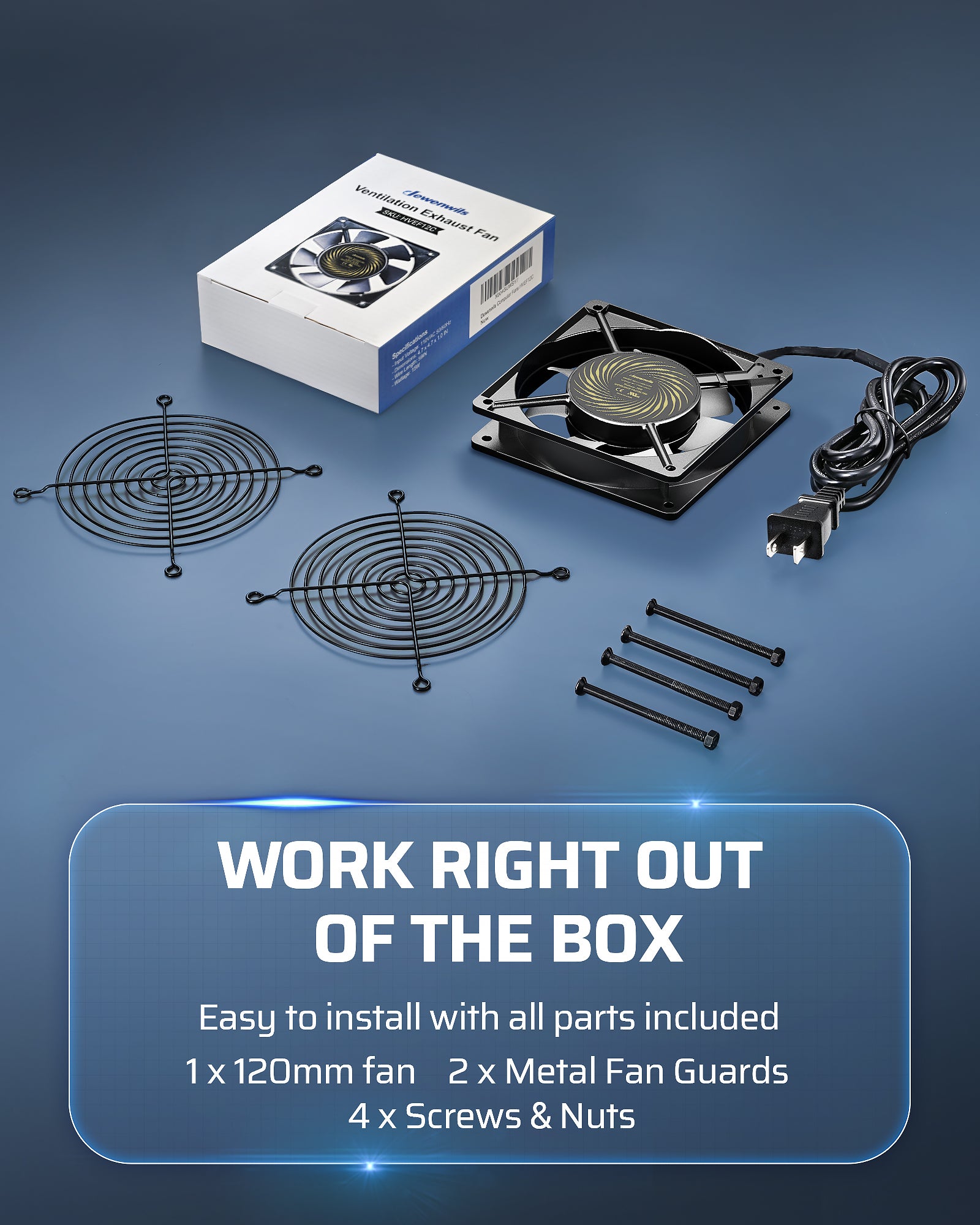 Includes a heavy-duty aluminum fan with power plug cord, two fan guards, and mounting screw set.