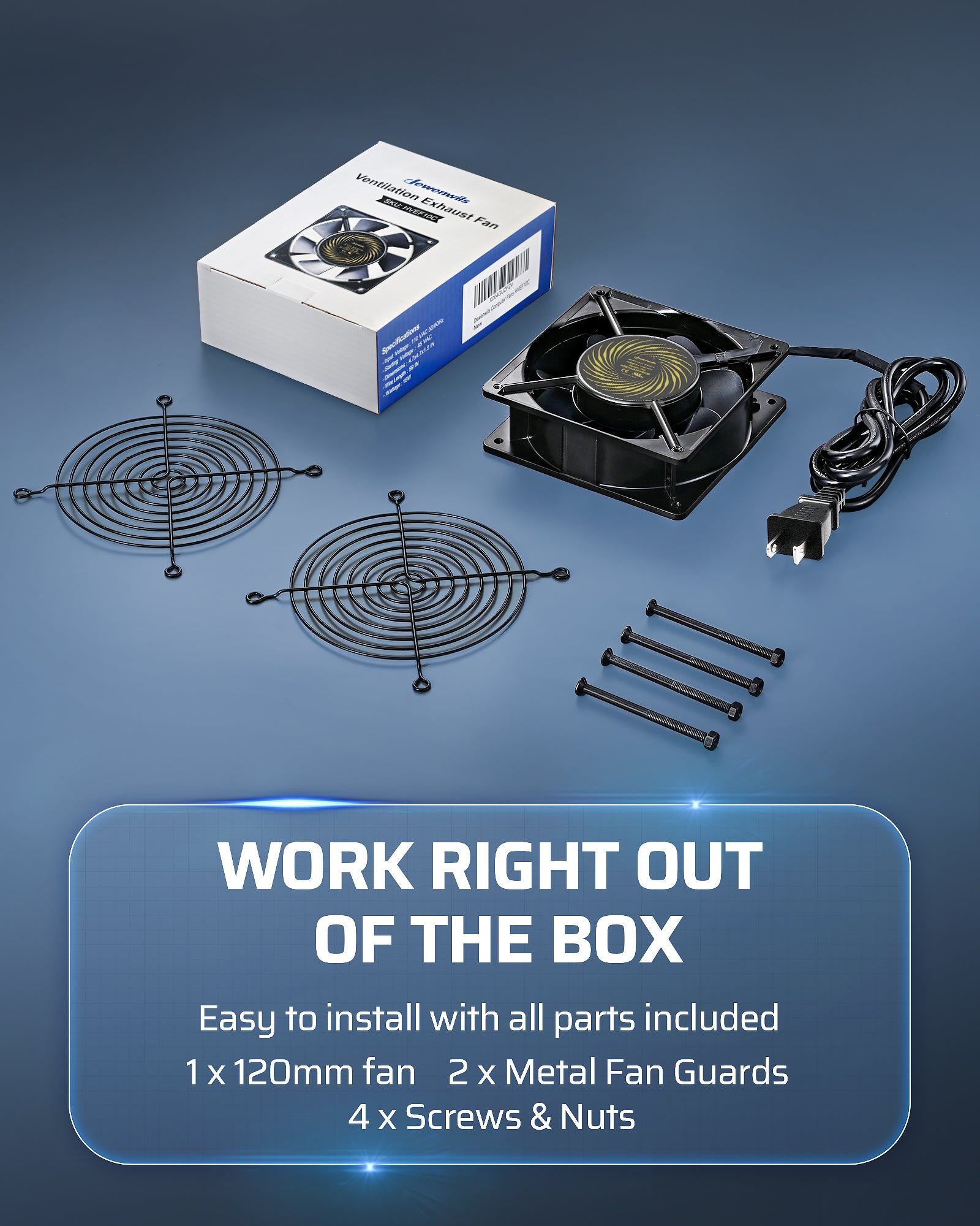 【Wide Application】This exhaust fan is perfect for various cooling or ventilation projects, making it an excellent choice as a replacement fan or for new installations; 1 heavy-duty aluminum fan with power plug cord, 2 metal grilles and mounting screw set included; ready to use right out of the box; ideal for refrigerator, compressor, air hockey table, AV cabinet, fireplace