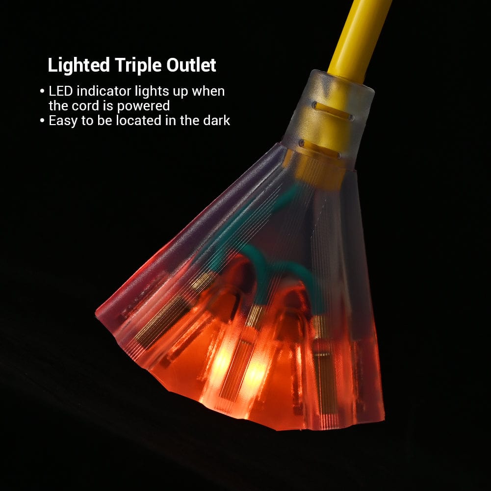 LED indicator lights up when the cord is powered; easily find out the power before you ever plug in by seeing the lighted triple tap connector. It reduces the chance of tripping over the cord, adding extra safety.