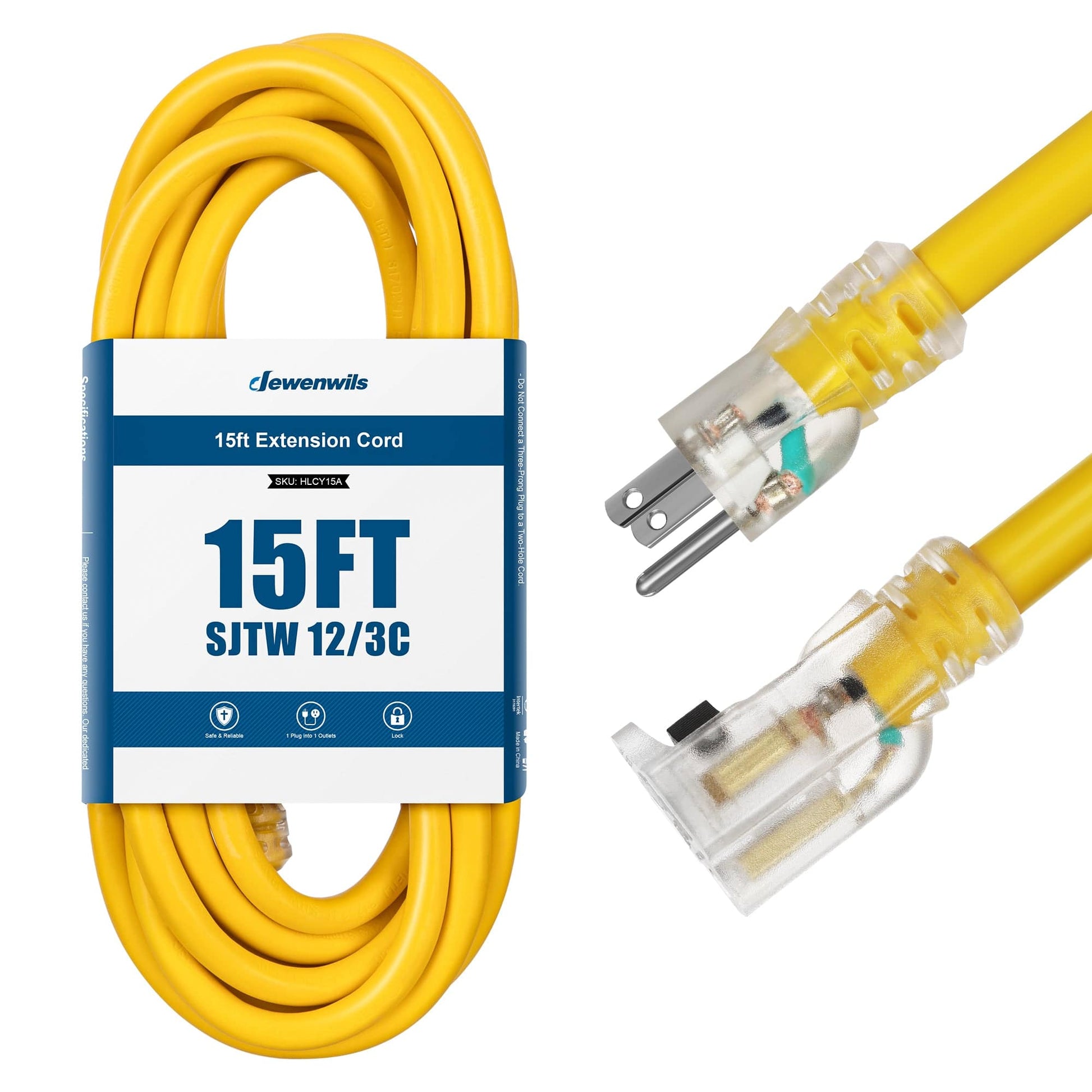 DEWENWILS 15ft Indoor/Outdoor Extension Cord with Lock, 12/3 Gauge SJTW 15 Amp Yellow Outer Jacket Contractor Grade Heavy Duty Anti-Shedding Power Cable with LED Lighted Plug-HLCY15A