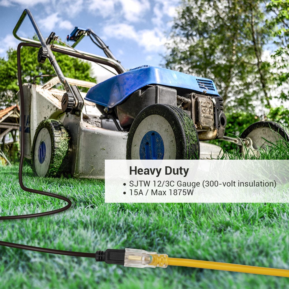 【15 FT Heavy Duty Extension Cord】This 15-foot extension cord boasts a heavy-duty design suitable for more demanding applications. With a 15A / 125V / 1875W power rating, this cord can handle tools such as leaf blowers, lawn mowers, pressure washers, weed whackers, electric drills, and power saws with ease. The premium grade STW 12/3 gauge contractor grade power cable features thicker insulation rated up to 600 volts, ensuring durability and longevity even in harsher environments.