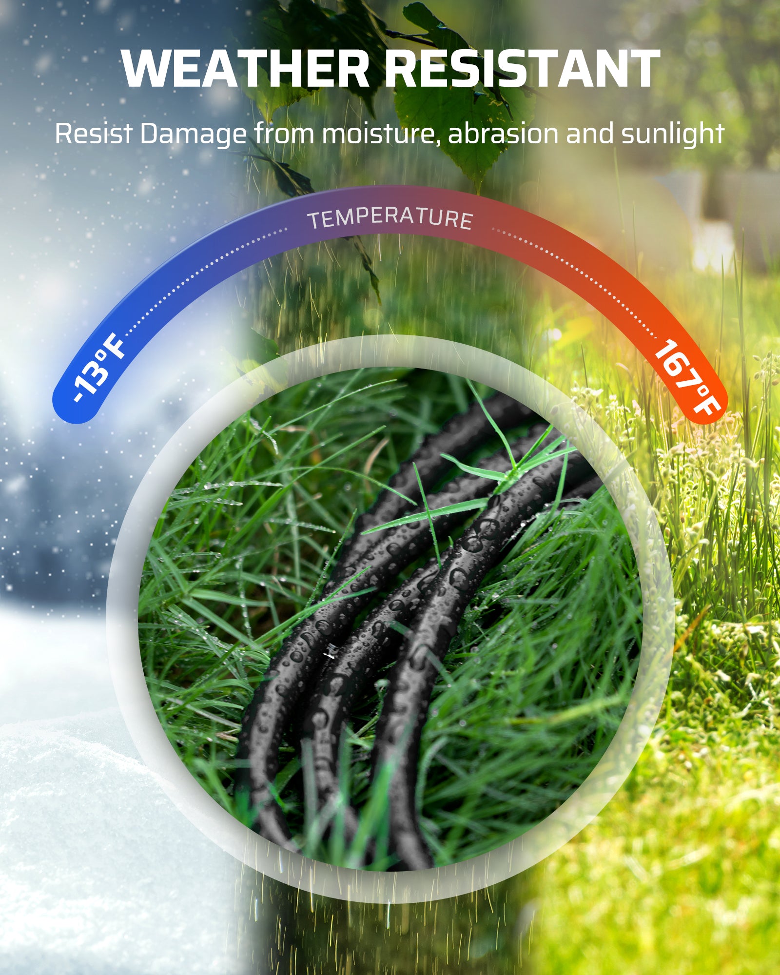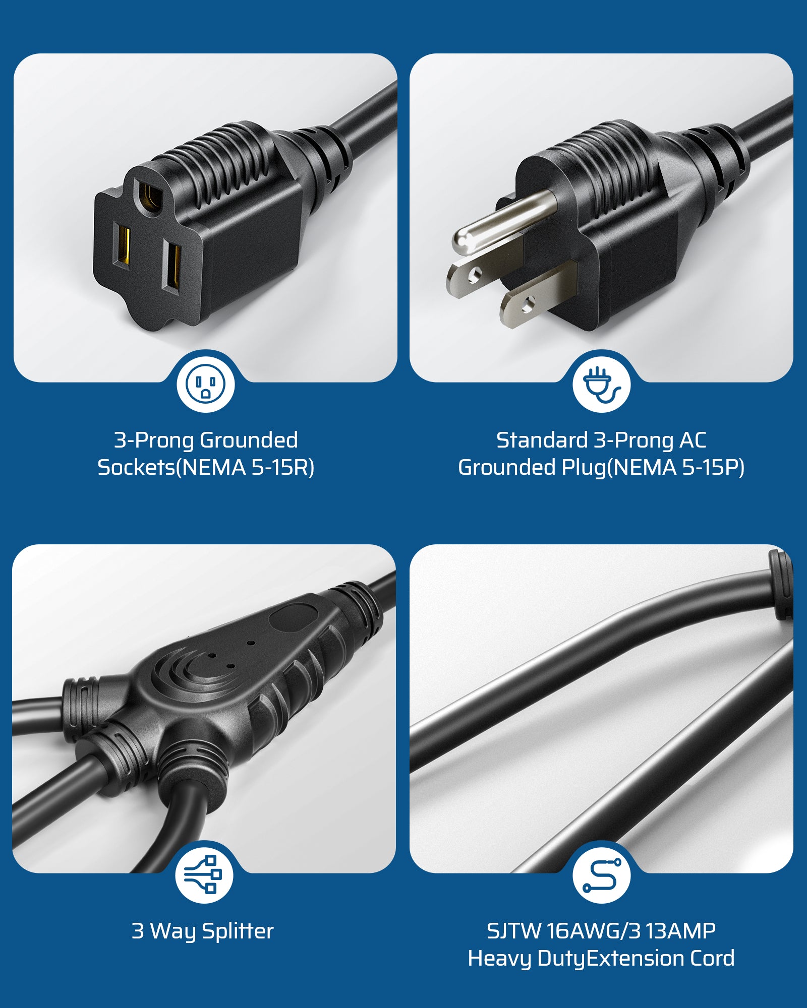 【 DURABLE EXTENSION CORD】This heavy gauge power cord extension is made of upgraded 16/3 gauge SJTW wire instead of common SJT, making it a durable and reliable solution for a wide range of applications. The SJTW wire is rated weatherproof, suitable for temperatures ranging from -13°F to 167°F. The PVC jacket provides added protection against moisture, abrasion, and direct sunlight, ensuring that the cord lasts longer and performs better even in demanding environments.