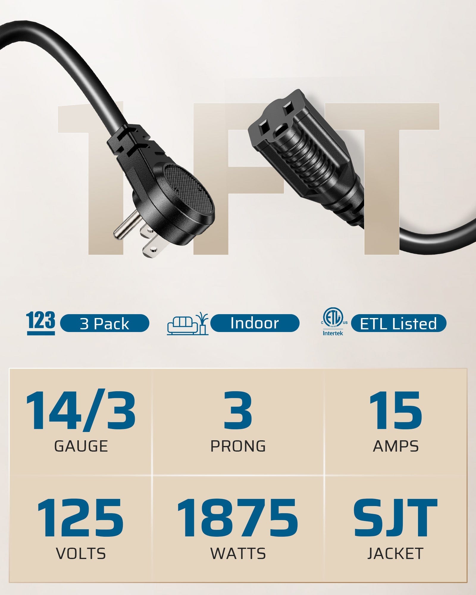 【3 PRONG GRANDED POWER CORD】This extension cord is suitable for use with appliances that require a 3-pin male-to-female power connector. The 3-pack option is more economical and provides the flexibility to power multiple devices. Additionally, this product is ETL listed, meaning it has been tested and certified for safety and quality.