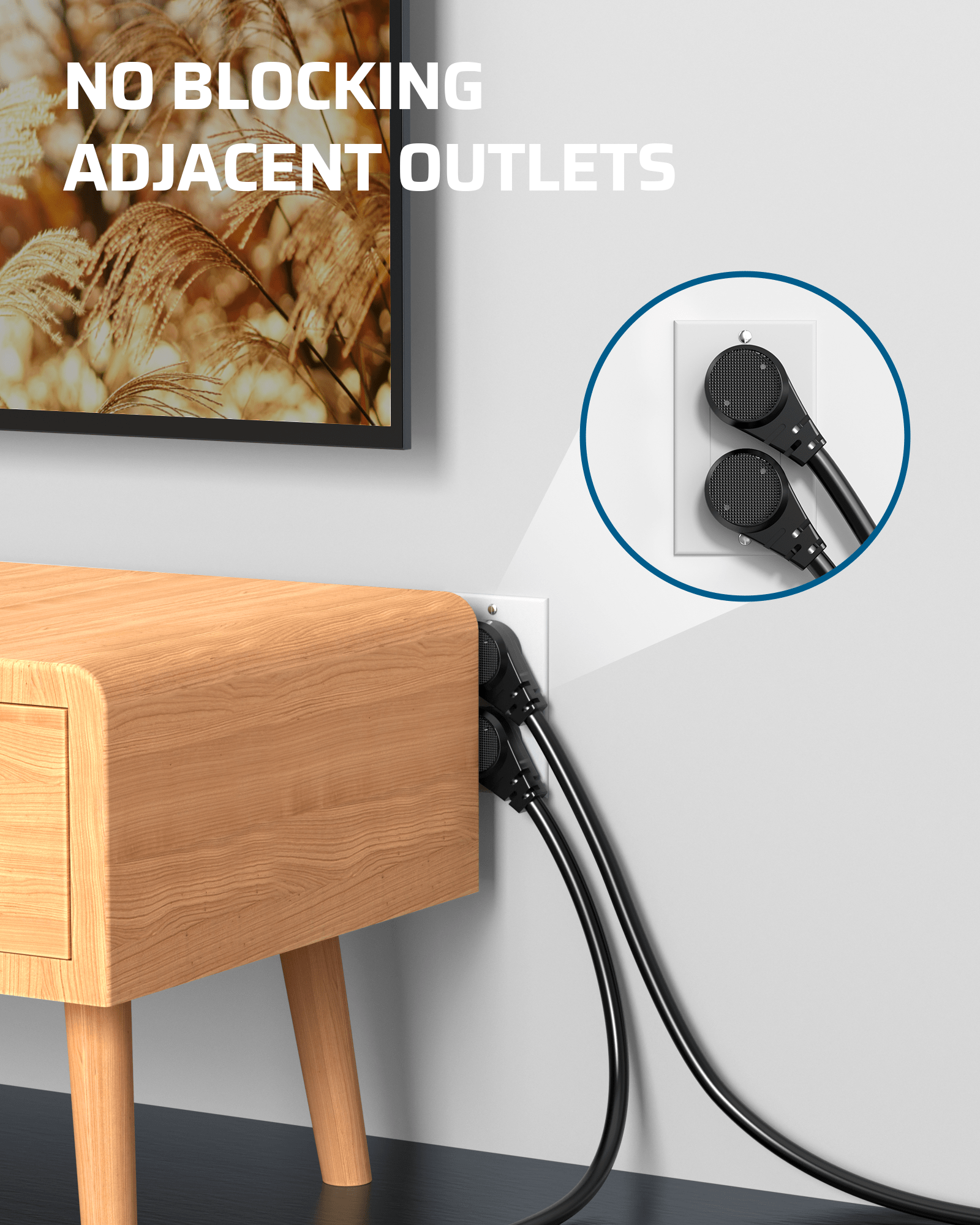 【SPACE-SAVING DESIGN】This extension cord is designed to save space and is perfect for use in tight spaces behind furniture such as sofas, TVs, bookshelves, cabinets, and bedside nightstands. Its sleek design allows you to keep your furniture closer to the wall, freeing up valuable space in your room.