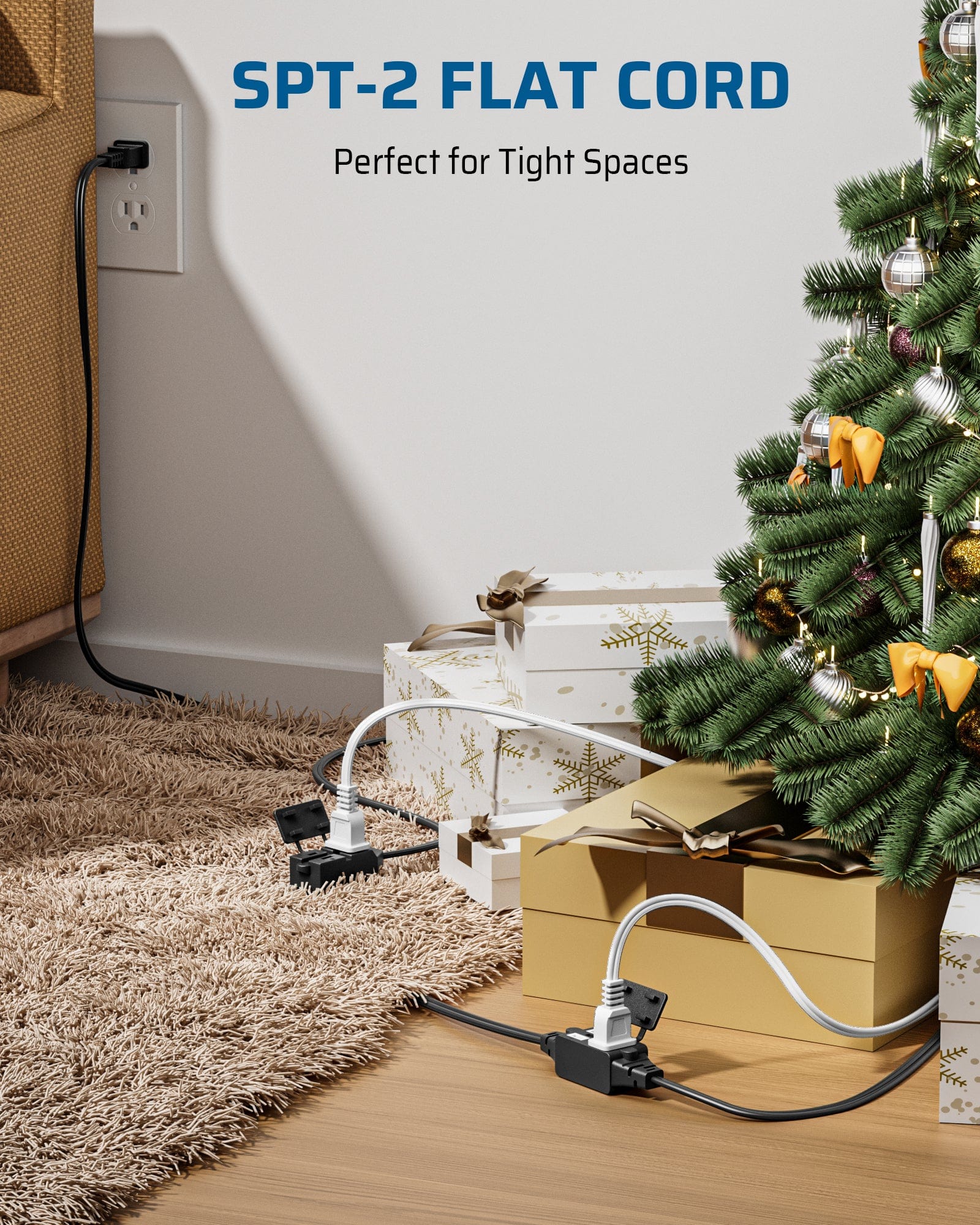 【Space-Saving with Flat Look】Designed with a slim SPT-2 flat cord, this extension cord is perfect for tight spaces; it easily fits under carpets, rugs, or baseboards, reducing tripping hazards while keeping your living space tidy and organized
