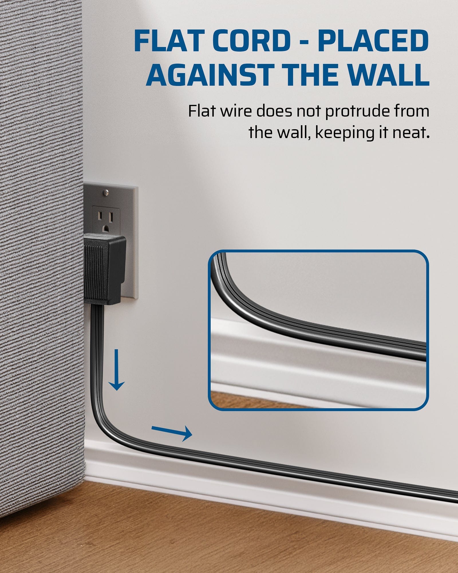 【Space-Saving Flat Plug】Featuring a 6-foot long power cord with a flat plug design, this flat extension cord effectively saves space and easy to plug and unplug; in tight spaces, it fits perfectly against the wall and hidden behind furniture such as sofa, bedside table, cabinet, and dresser, keeping your home neat and beautiful