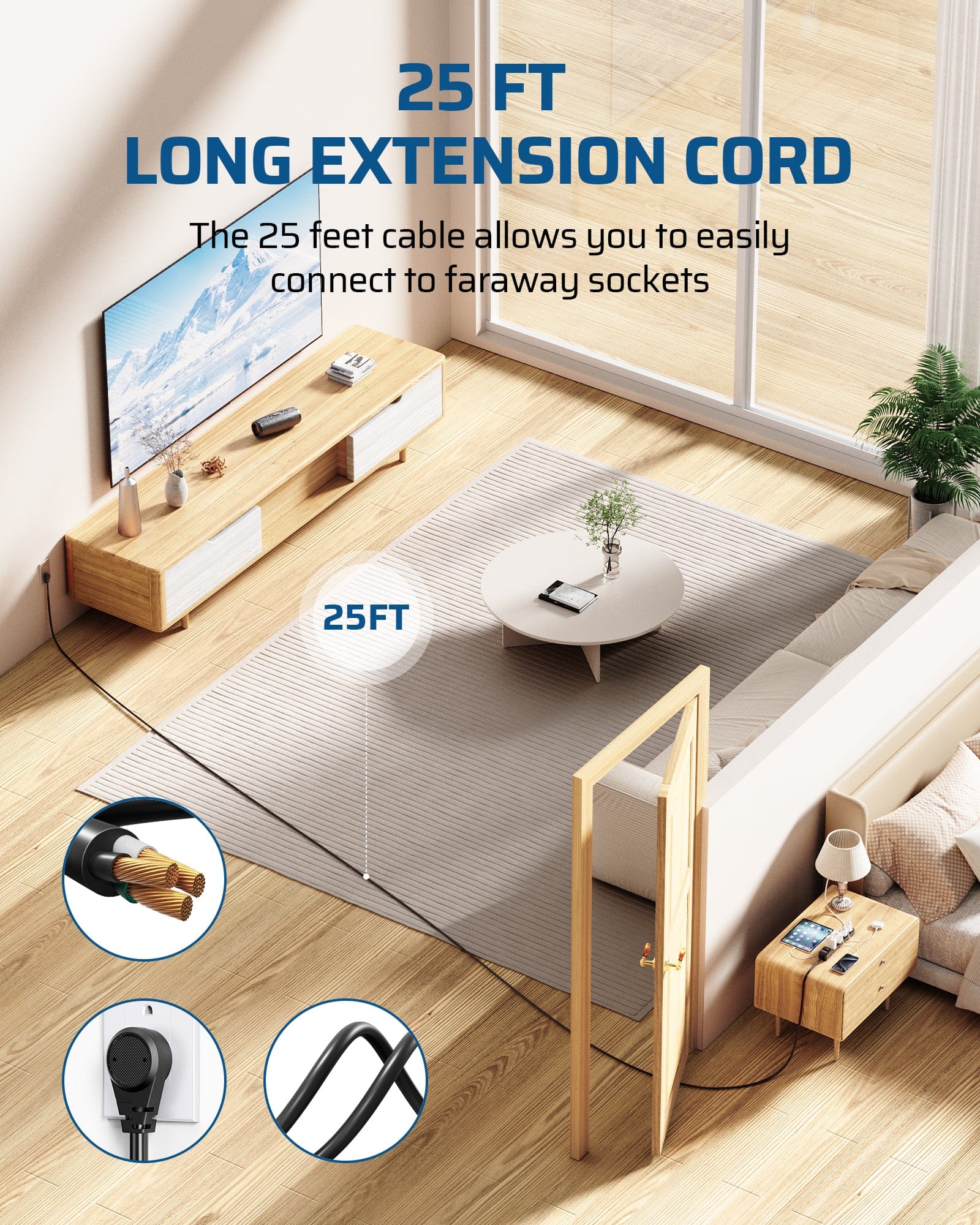 【 25 Ft Long Power Cord 】This electrical surge protector power strip comes with a 25-foot extra-long extension cord, providing flexibility to access distant outlets and hard-to-reach places. The SJT 14/3C gauge durable power cord is sturdy and wear-resistant for long-lasting performance.