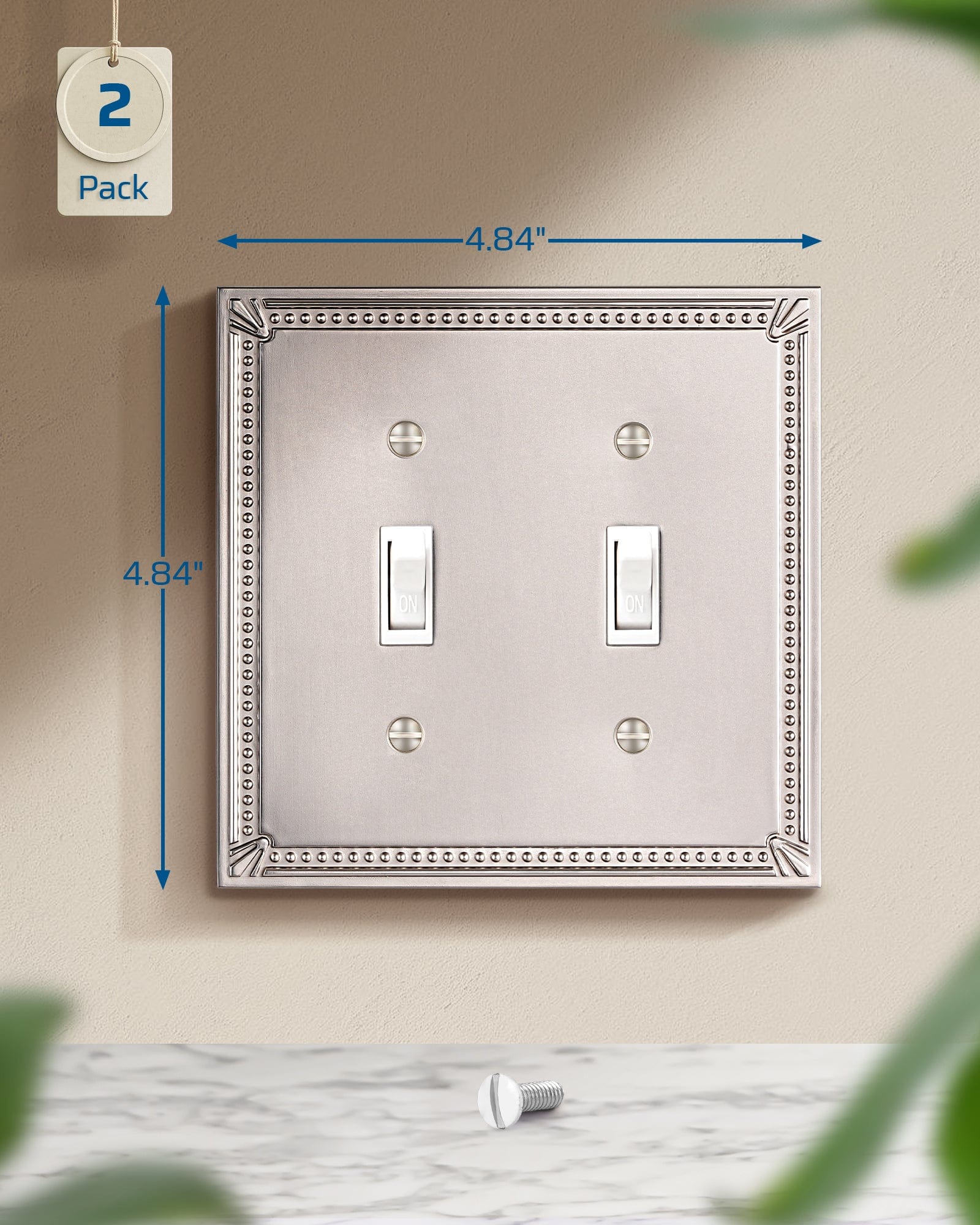 DEWENWILS 2 Pack Zinc Alloy Wall Plate Covers, 4.84"×4.84" Double Toggle Outlet Cover, Satin Nickel Finish Light Switch Plate Cover, Sunken Pearls Decorative Wall Plates Electrical Outlet Cover-HTTP04F