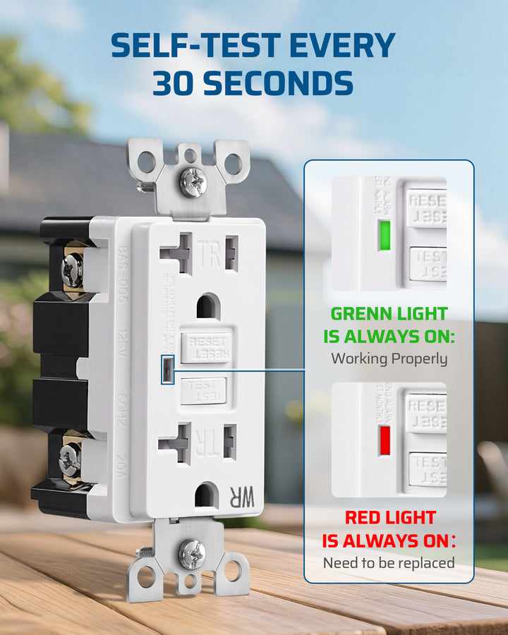 - [Smart Self-Test] Green light stays on to confirm proper installation and normal operation, while the red light flashes about every 30 seconds during self-checks, giving you continuous GFCI protection and peace of mind