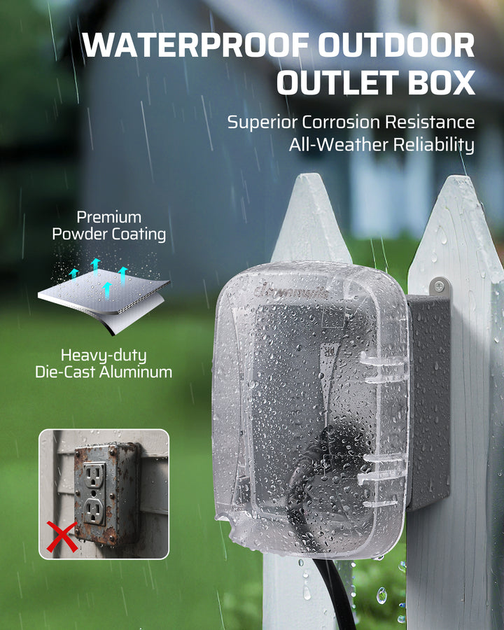 - [Weather-Resistant Cover] Crafted from transparent PC material, this cover lets you easily monitor the outlets while providing excellent resistance to rain, snow, and dust, ensuring safe and reliable outdoor operation in all weather conditions
