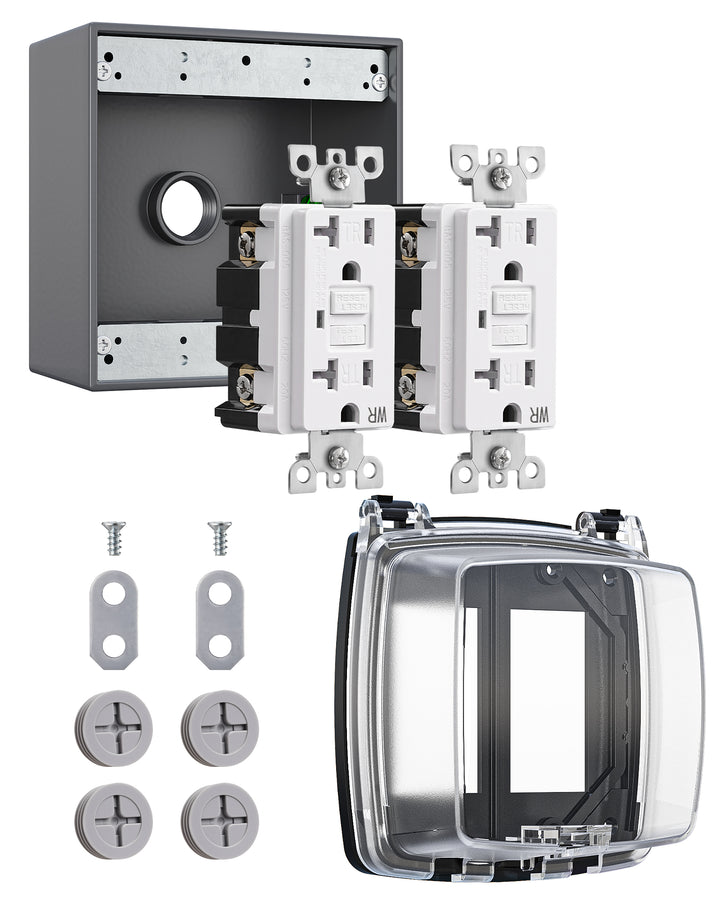 - GFCI Kit: Metal box, 20A outlet, weatherproof cover.