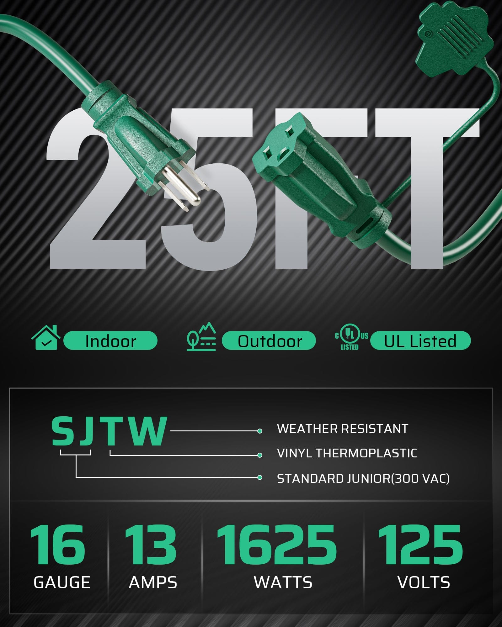 【 Evenly Spaced 3 Outlets 】This 25-foot green extension cord has 3 evenly-spaced outlets located 8 feet apart, making it ideal for setting up landscape lighting and Christmas decorations. With fewer cords to manage, this extension cord offers convenience and ease of use.