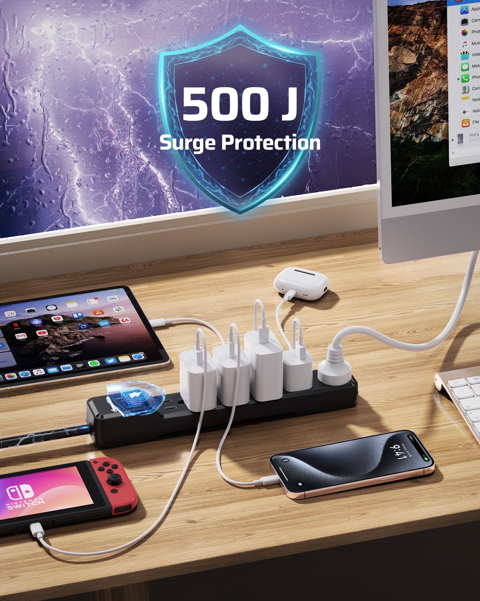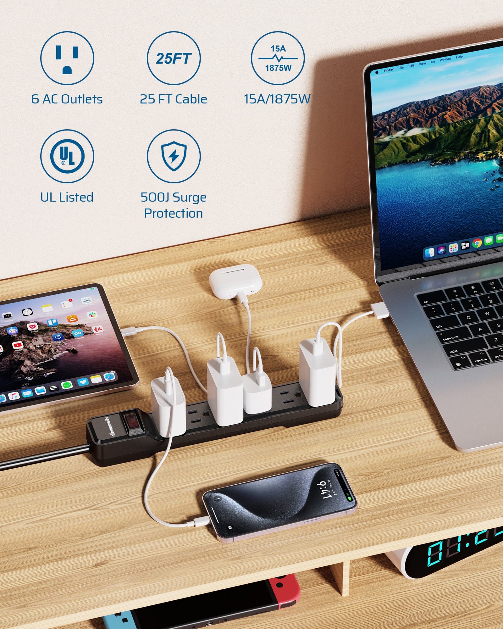 【Superior Safety】This power strip is UL approved and has a 500 joules surge protection rating. The surge suppressor, combined with a 15 amp fused power switch circuit breaker, protects your electronic devices from lightning, surges, spikes, short circuits, and overloads.