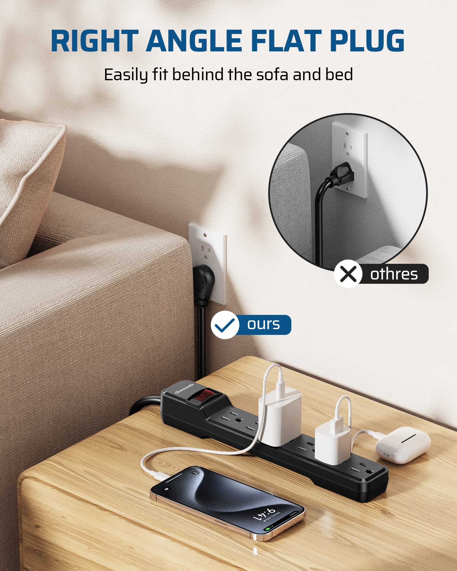 【Low Profile Flat Wall Plug】The right angle flat plug of this power strip allows furniture to be pushed against the wall, making it ideal for cramped living spaces like behind a TV bracket, sofa, nightstand, or headboard. Its compact and slim design also makes it great for any office or small living space.