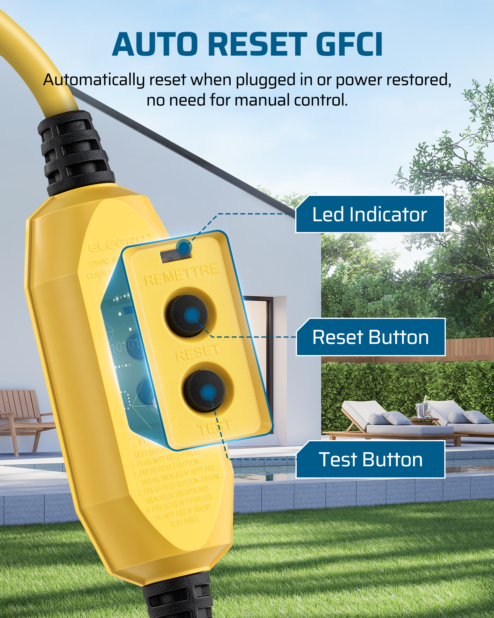 【GFCI Protection】With an attached GFCI, this power cable provides enhanced safety when in use. This valuable feature provides electric shock protection and helps prevent the risk of electrical fire caused by ground fault. Additionally, it will automatically resets when plugged in or when power is restored after an interruption.