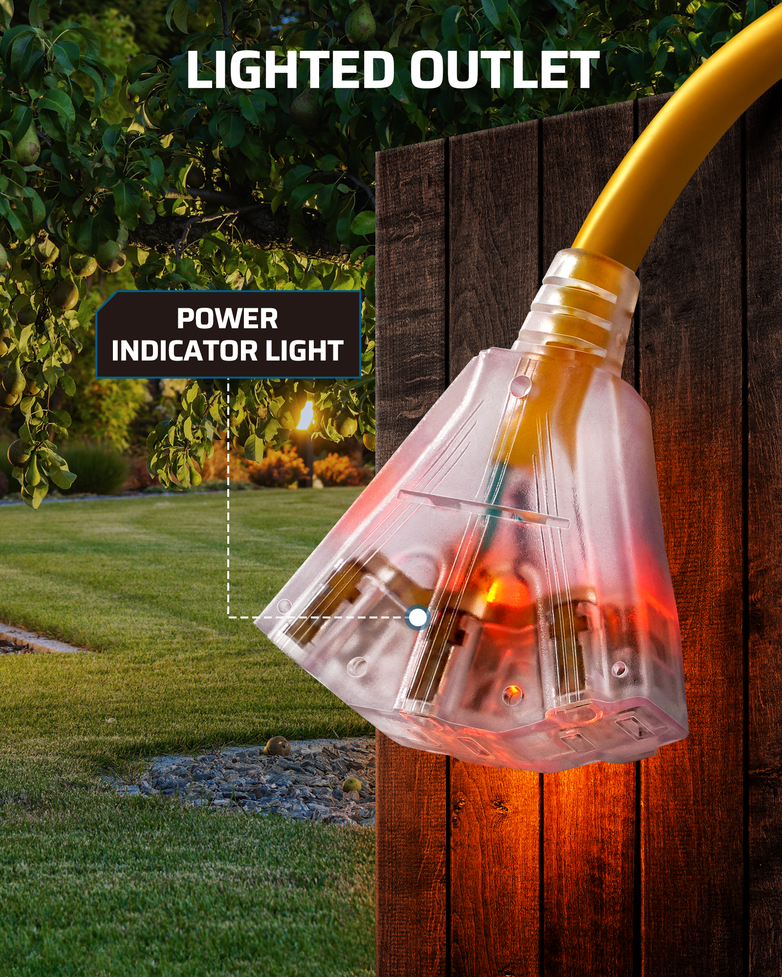 【Lighted Extension Cord End】LED indicator shows when powered for easy use. All-copper wire, reinforced blades, double jacketed cords, full-molding design, and UL certification ensure durability, safety, and reliability.