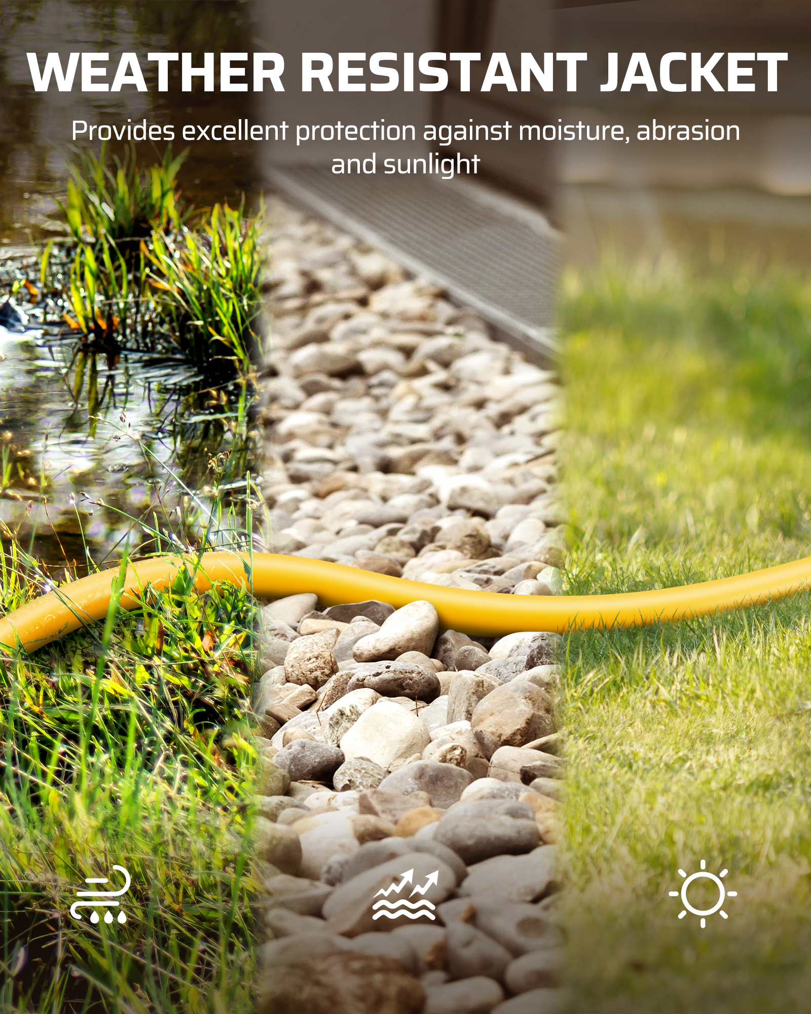 【For Indoor/Outdoor Use】This power cord splitter has a durable yellow PVC jacket that resists wear, tear, abrasion, moisture, and sunlight. It can handle temperatures from -40°F to 140°F. However, the connections must not be immersed in water.