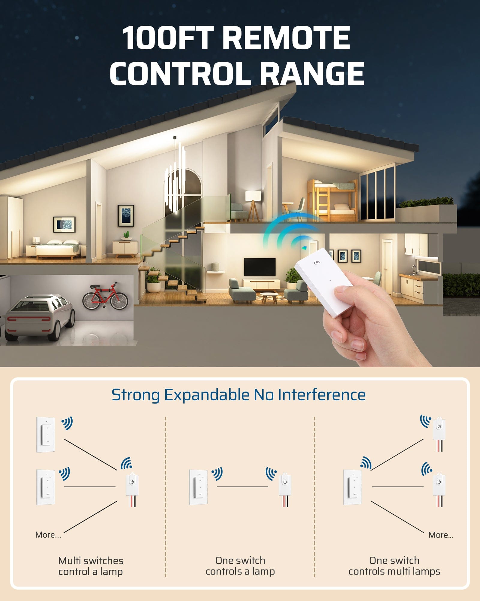 【Strong Signal & Wide Use】Powerful RF signal penetrates walls and doors, remote control up to 100ft in open areas without interfering with existing systems; remote light switch is perfect for attics, stairwells, hallways, basements and garages