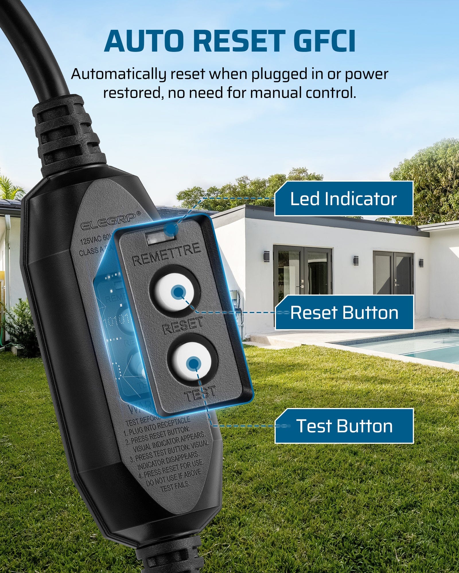 【Auto Reset Function】With auto-reset function, this power cord extension will automatically reset when plugged in or when power is restored after a power off; meets UL standards for GFCIs, ensuring safe and secure use