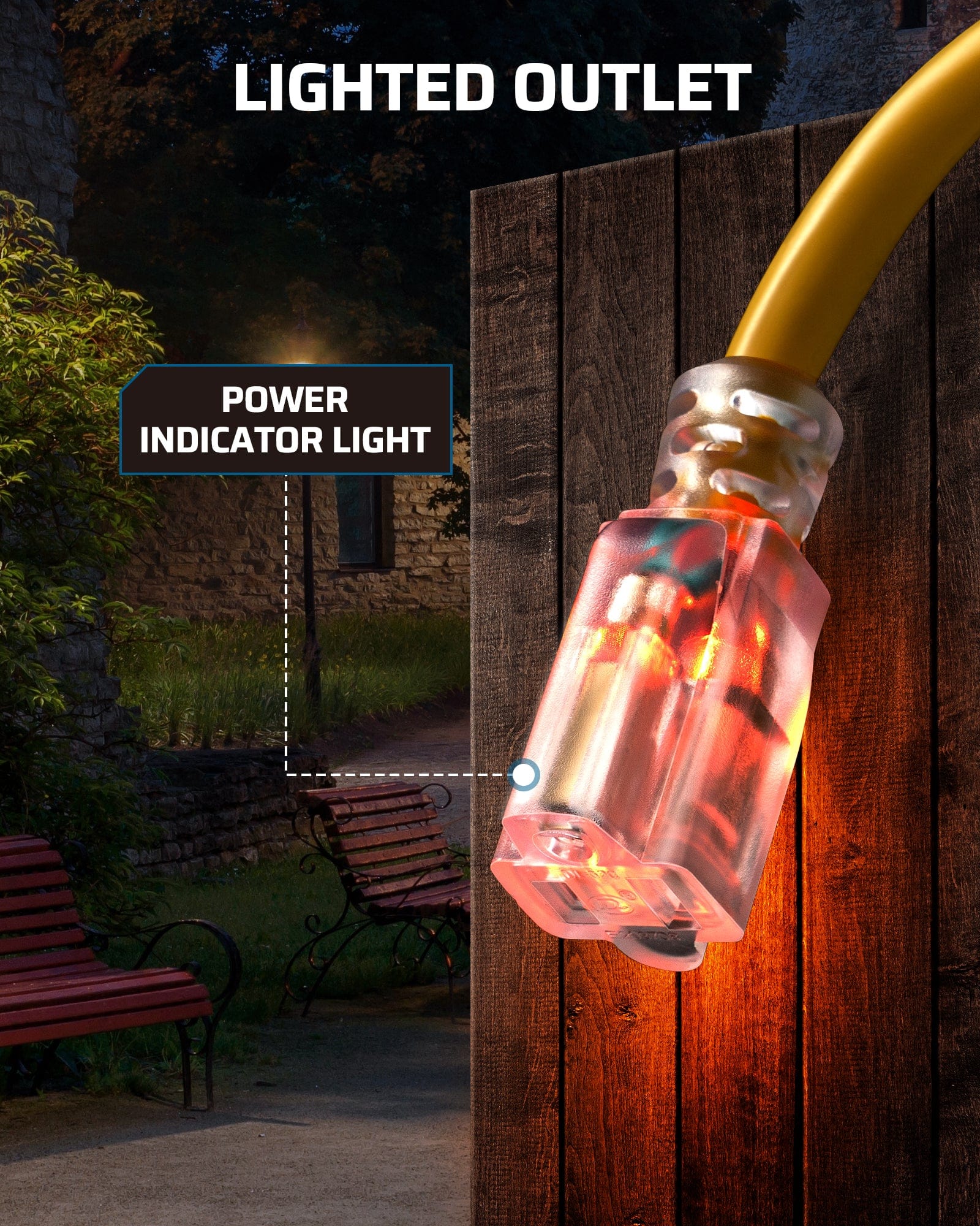 【Pigtail Plug with Indicator Light】Features a single-socket clear plug with light on the end that illuminate when the power cord is energized, letting you know that the GFCI extension cord is available and easy to find, especially in the dark
