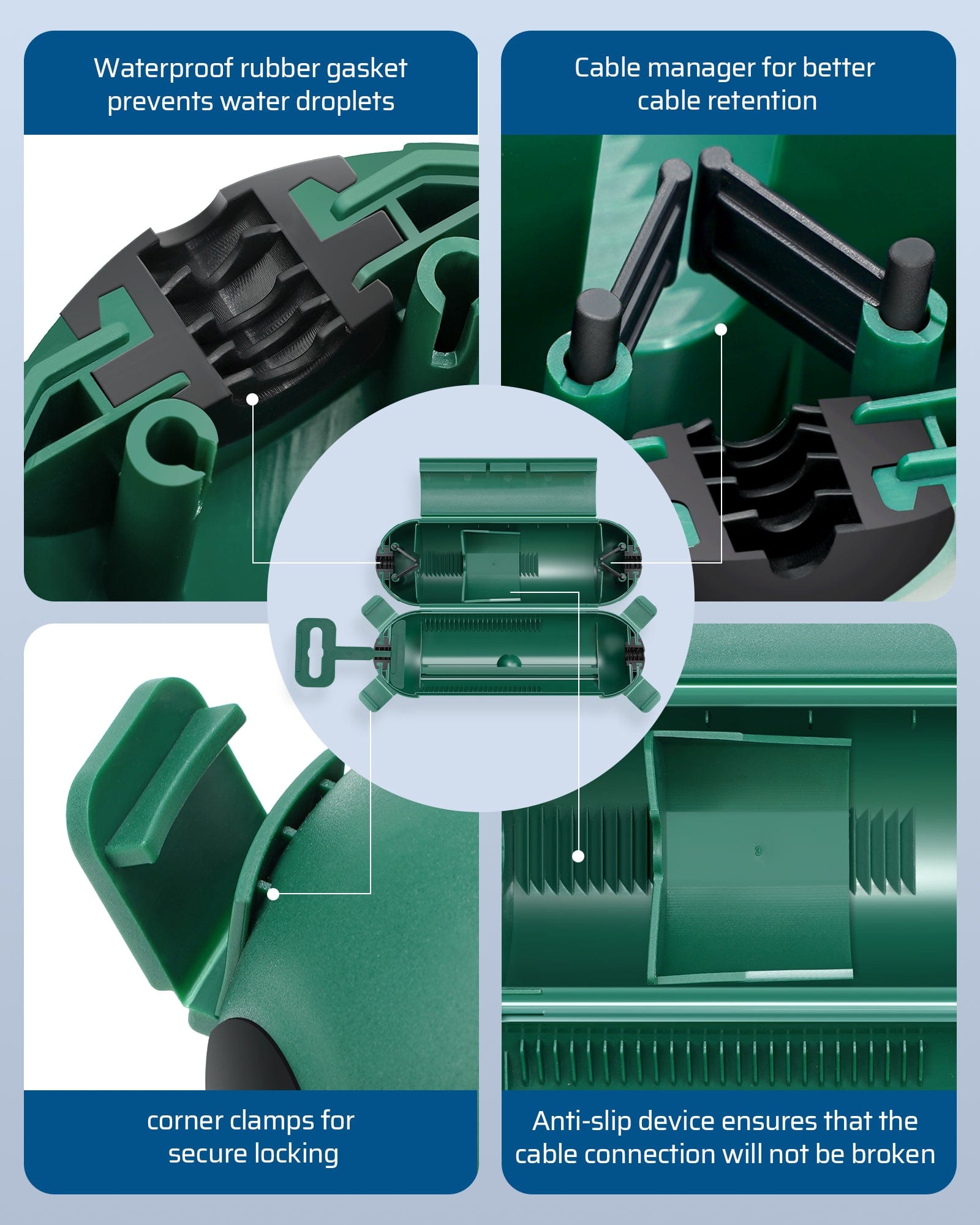 【EASY TO USE】 This extension cord connector is easy to use and requires no tools or installation. Simply place the extension cord properly and slide the limiter to keep the cords securely connected. Lock the top lid and 4 latches for a tight seal. It can also be hung up to save space. This connector is ideal for use with various outdoor appliances such as holiday lights, string lights, pool pumps, garden tools, and more.
