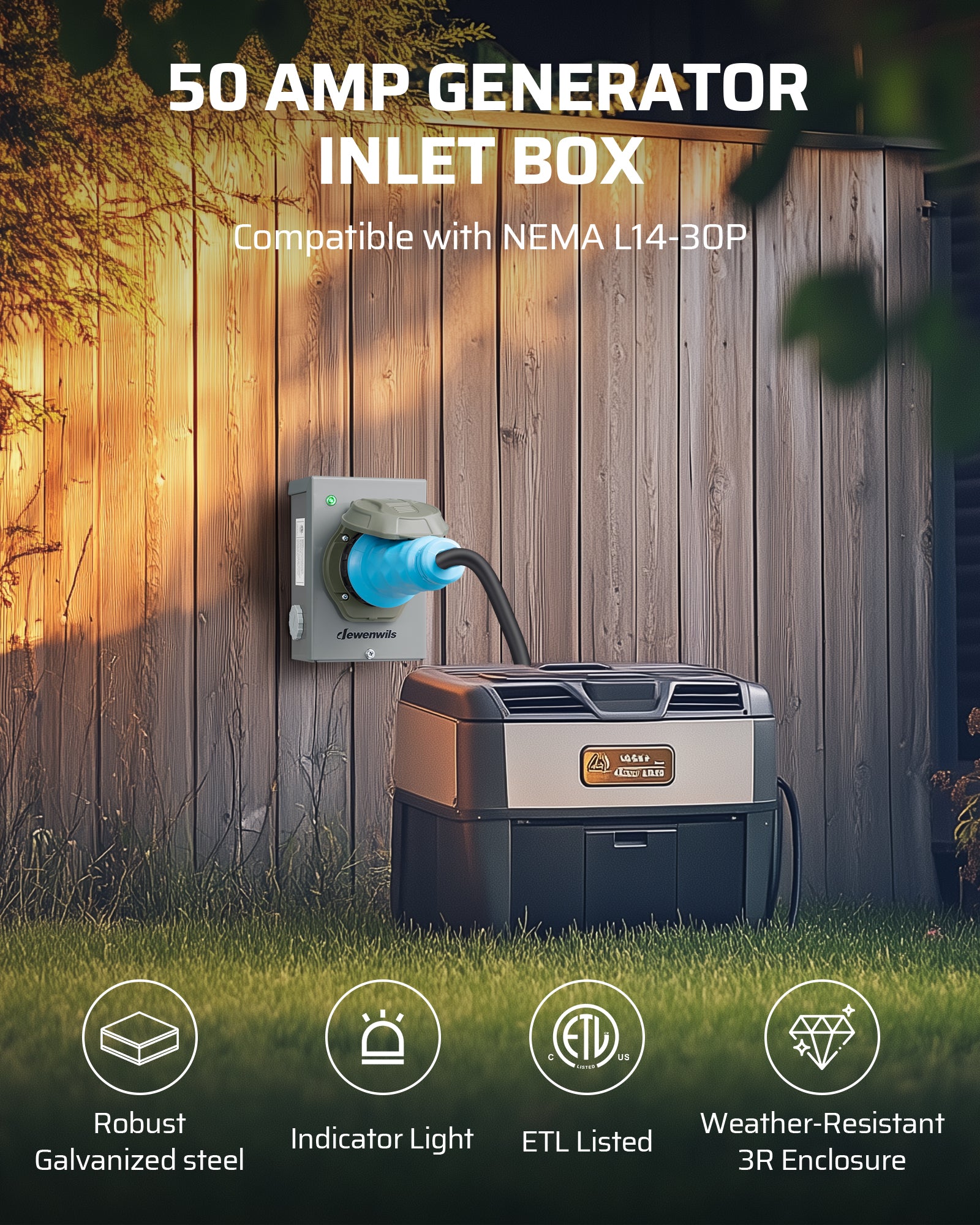 DEWENWILS 50 Amp Generator Inlet Box, Pre-drilled NEMA SS2-50P Power Inlet Box, 4-Prong Generator Cord, 125/250V, 7500/12500W, 3R Weatherproof for Outdoor Use-HGPB50A