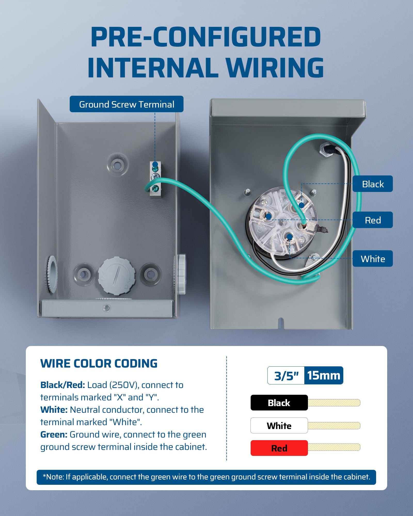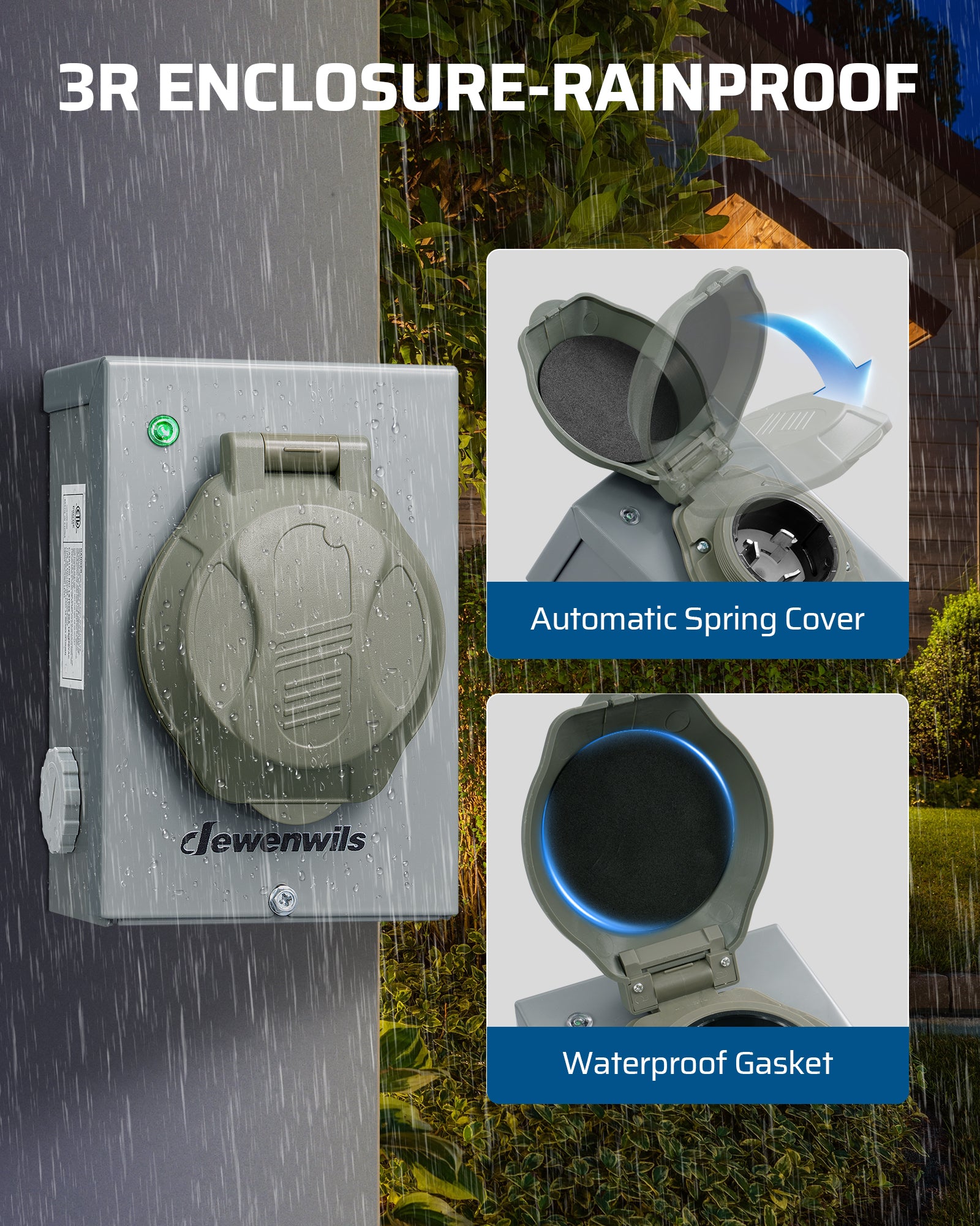 【Waterproof 3R Enclosure】Built from galvanized steel with a 3R-rated rainproof housing, this outdoor power inlet box is designed to withstand harsh weather and effectively resists rainstorms, UV exposure, and corrosion