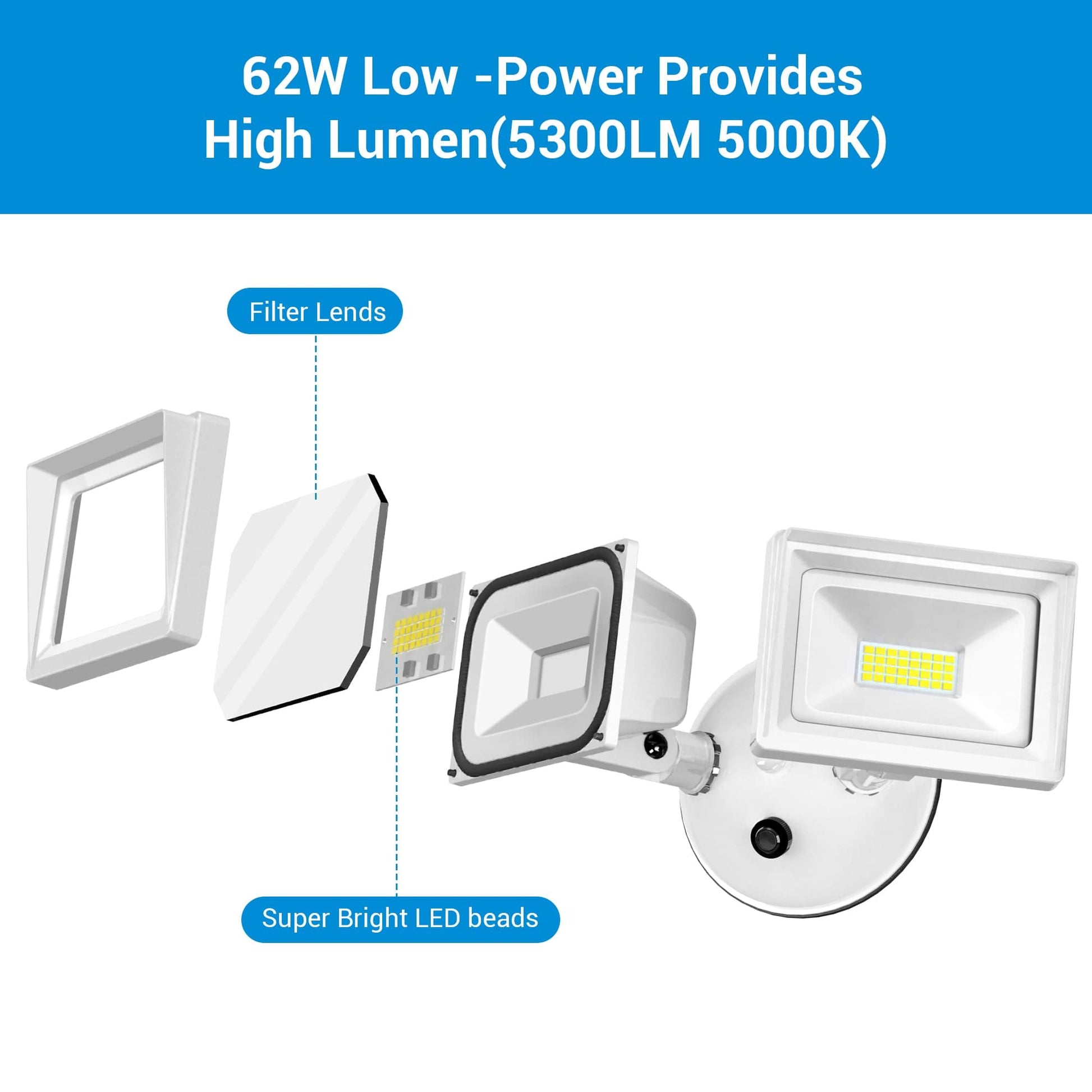 【5400LM Super Bright & Energy Saving】This 62W dusk to dawn LED security light is equipped with 64 advanced high-efficiency LEDs, producing up to 5400lm of high brightness. It can save you more than 80% on your electricity bill. Please note that it is not a solar light and does not come with a motion sensor.