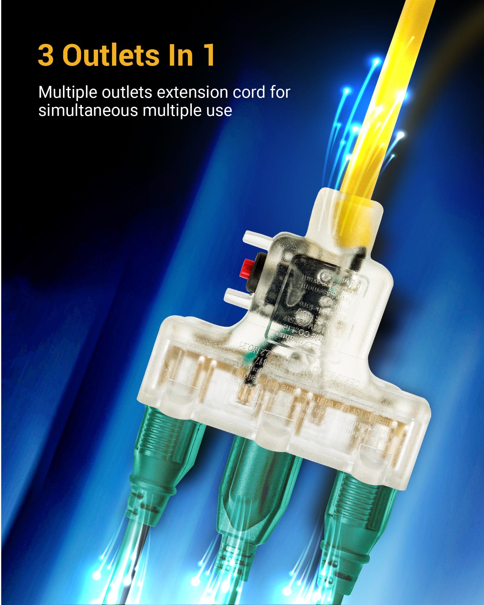 This outdoor Tri-Tap extension cord splitter, coated in wear resistant yellow PVC outer jacket,is extremely tough and can resist tearing, abrasion, moisture and exposure to sunlight.
