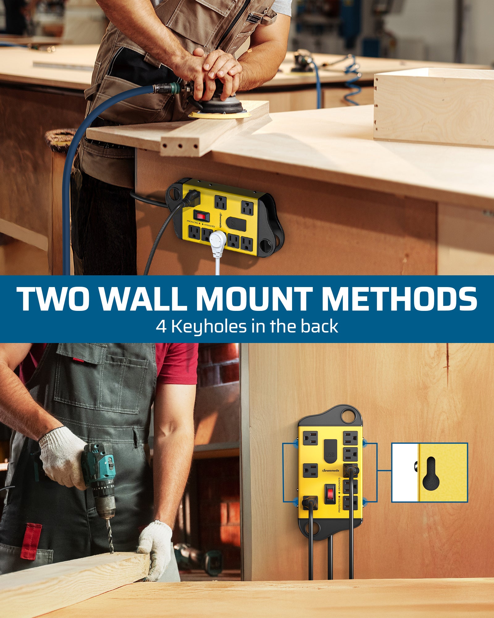 【Wall mountable】This power strip is designed with a cord holder for wrapping the cord or hanging it up, as well as two mounting keyholes on the back. You can mount this metal power strip on the wall to provide easy access for electrical tools. Its compact shape also makes it possible to mount it to a workbench or under a desk.
