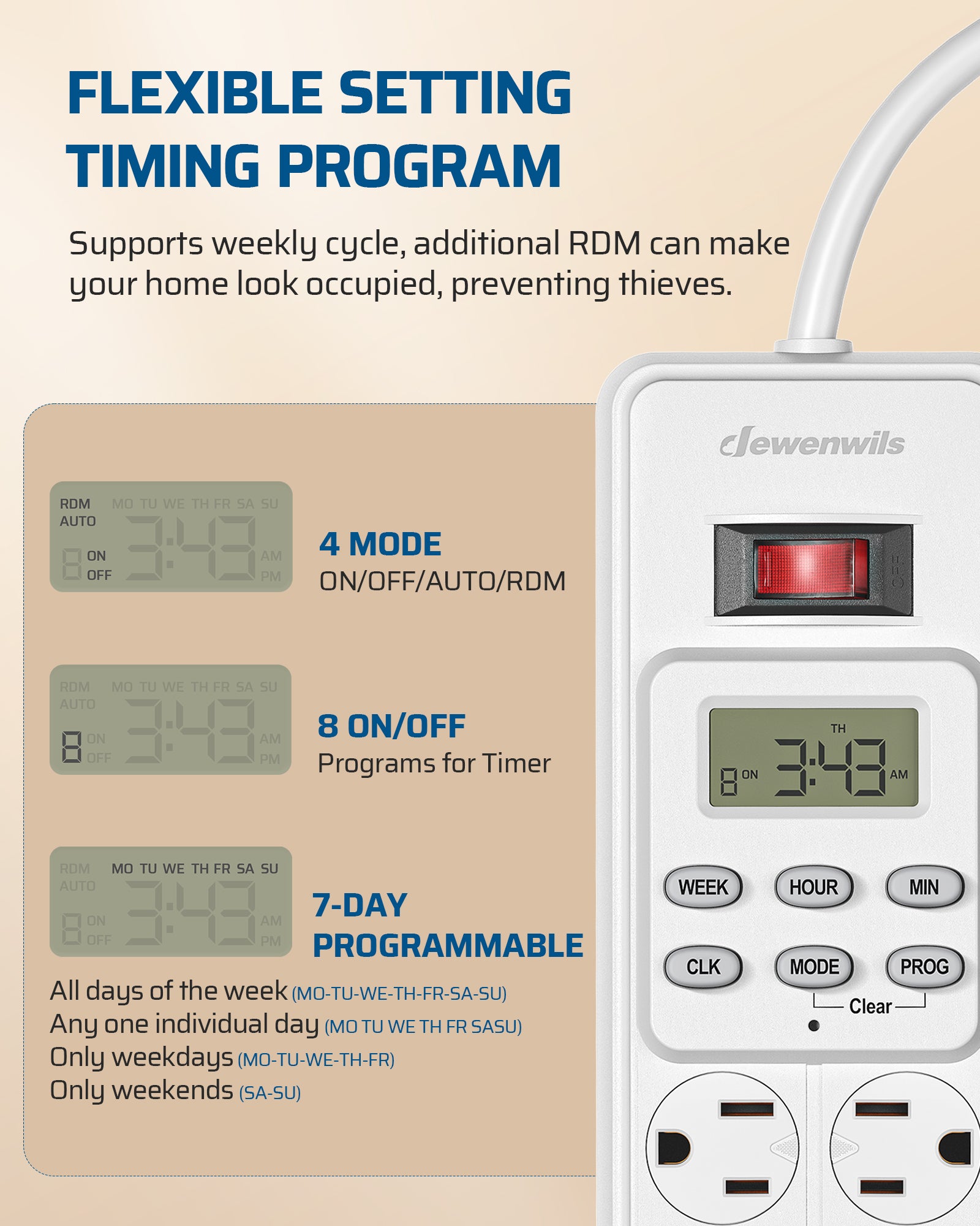 【Safe & Reliable】UL-certified with overload protection, this outlet timer power strip is built for safety; rated at 15A, 125V, 1875W, and 60Hz, with a durable 14/3AWG power cord; the built-in battery saves your programs for up to 3 months during power outages