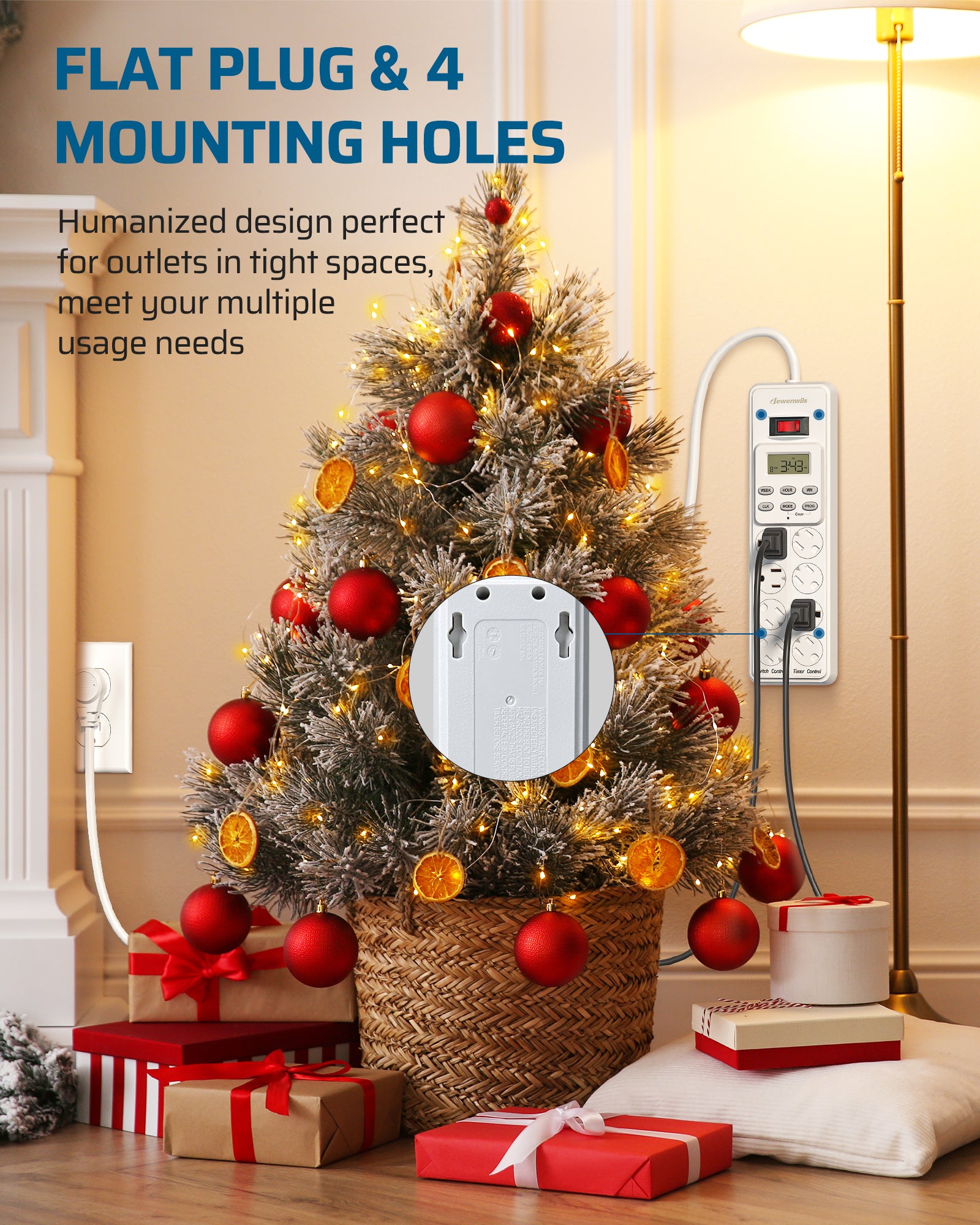 【User-Friendly Design】The flat plug fits behind furniture, while 4 rear mounting holes make it easy to hang on the wall; with a 6ft cord for flexible use and rotating outlet covers to block dust and prevent accidents, this digital timer power strip ensures convenience and safety