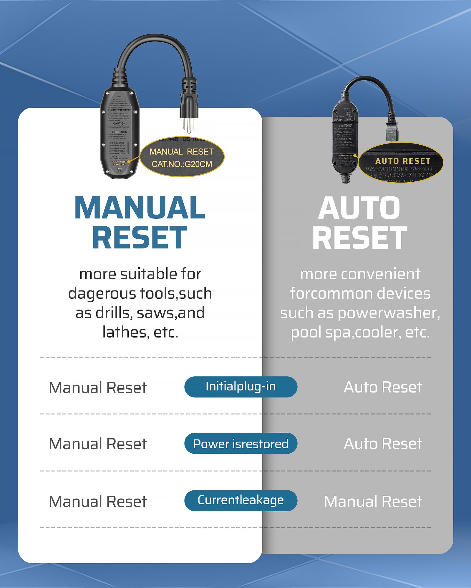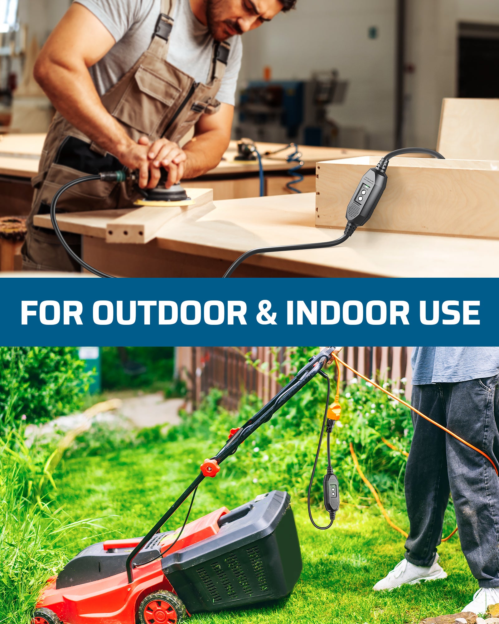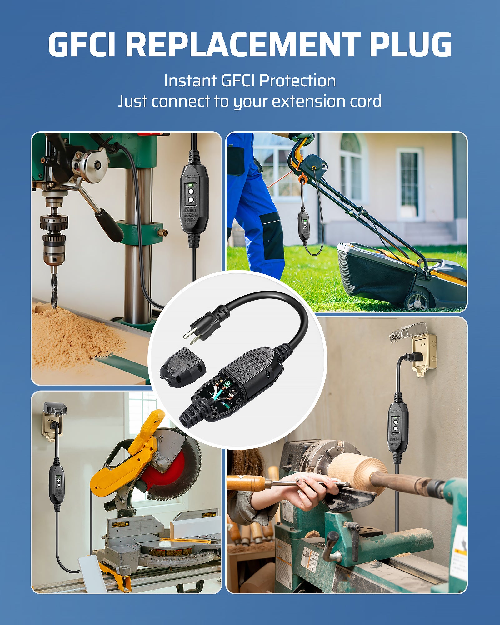 【Ideal for Indoor & Outdoor】Crafted from heavy-duty industrial materials, this auto-monitoring GFCI plug is an excellent safety upgrade for power tools used in hazardous environments; perfect for saws, drills, air compressors, lathes, lawn equipment, cutting machines, and more