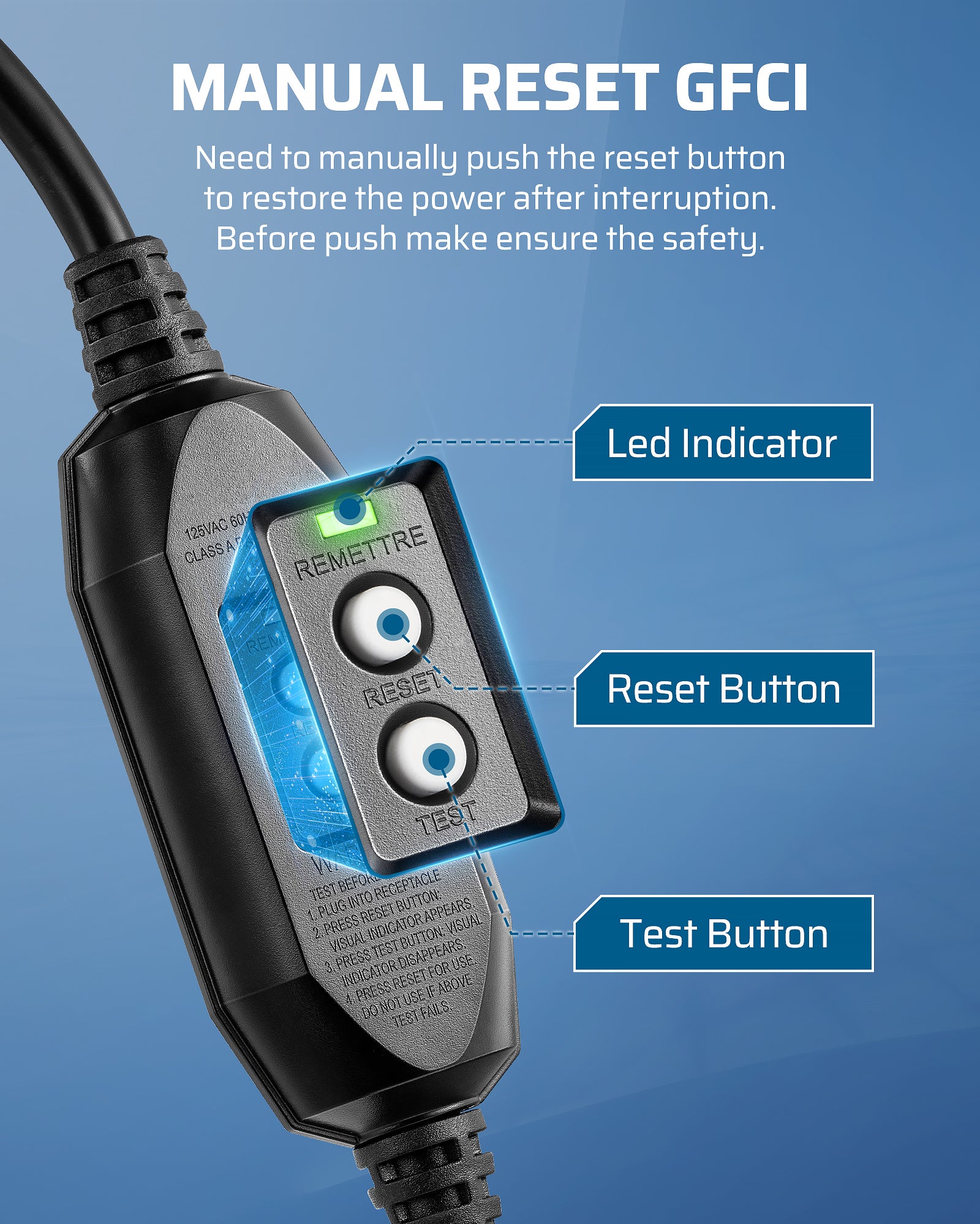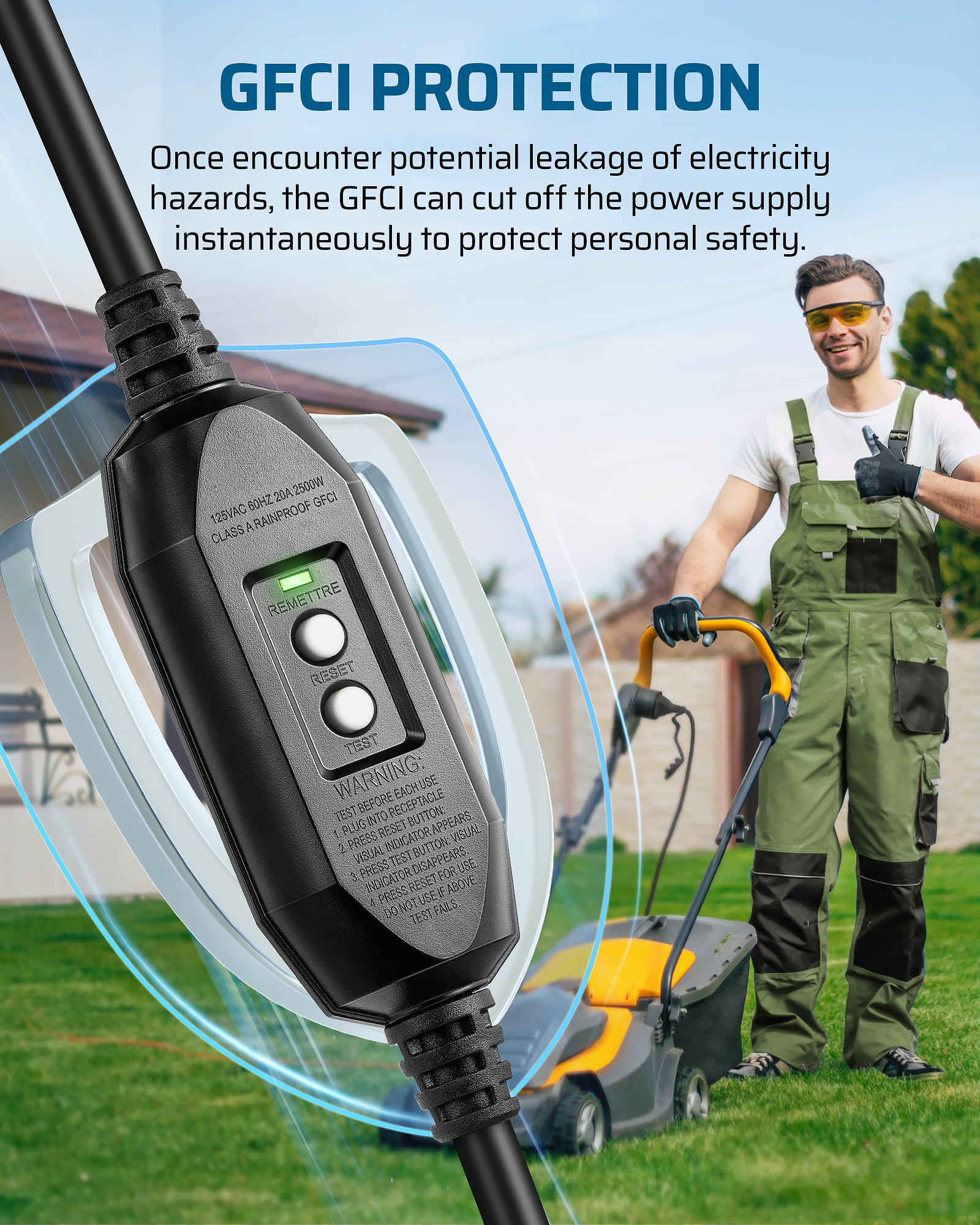 【Safe Plug with GFCI Protection】This plug with GFCI (Ground Fault Circuit Interrupter) protection, built-in test and manual reset for quick safety checks and resets when needed; in the event of a potential electrical hazard, the GFCI instantly cuts off power, effectively preventing electric shocks and safeguarding users