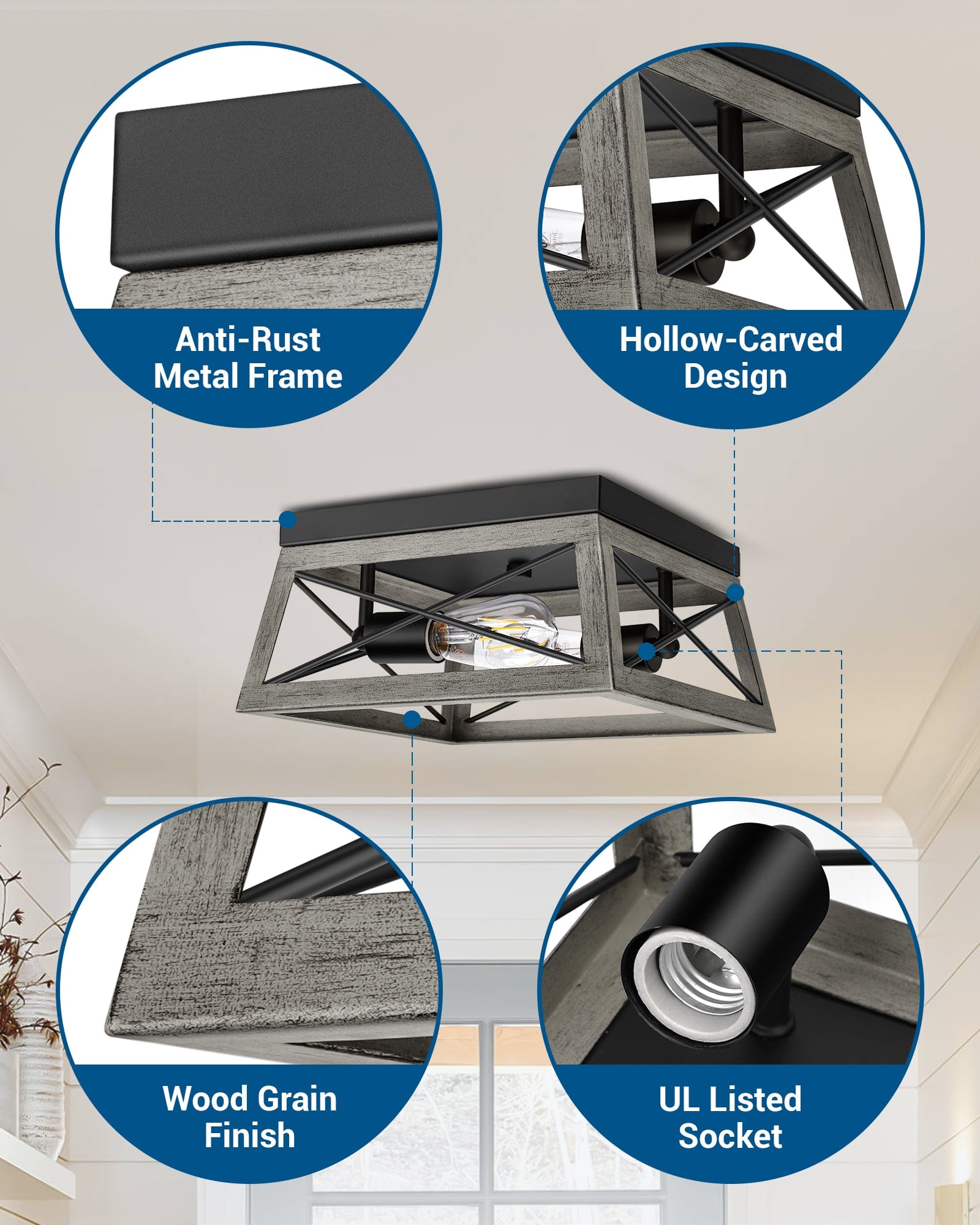 DEWENWILS Farmhouse Flush Mount Ceiling Light Fixture, 2-Light Close to Ceiling Lamp with Wood Grain Finish, Industrial Semi Flush Mount Island Light for Hallway Kitchen Entryway Living Room-HFCL02E