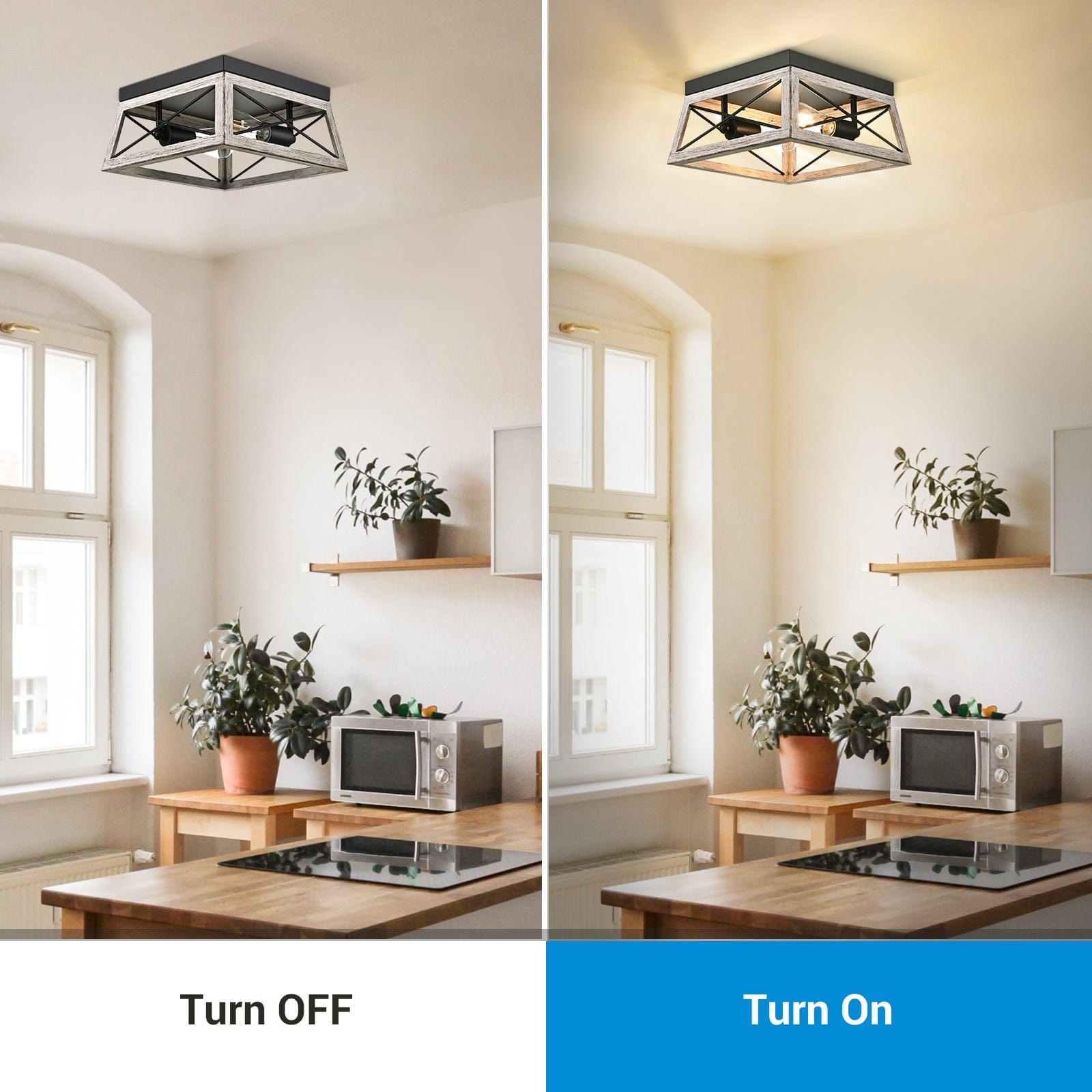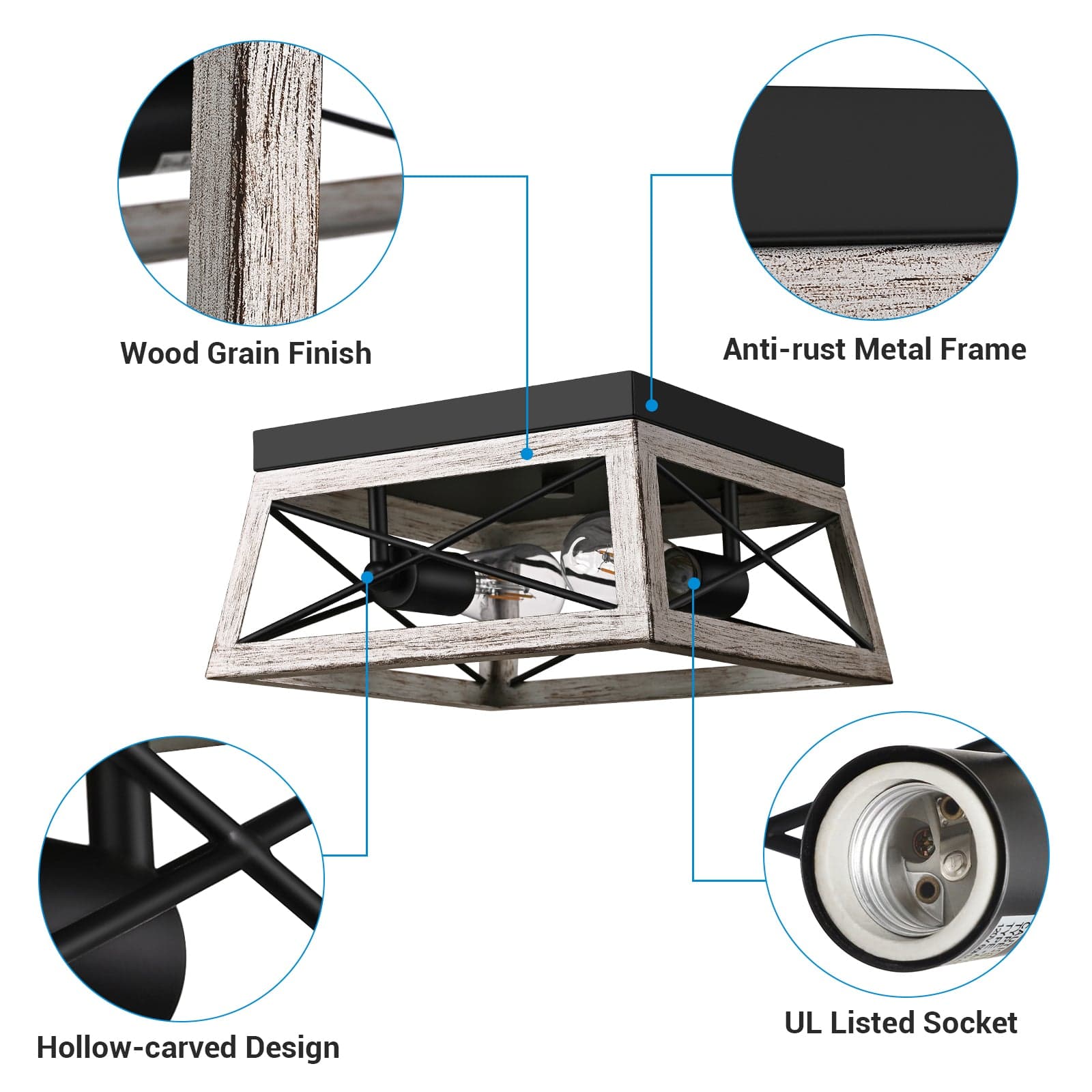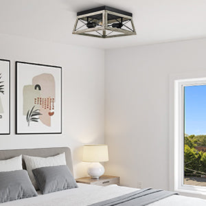 【Farmhouse Vintage Style】This retro ceiling light fixture features a simple geometric shape and is well-made with an X-shaped anti-rust metal frame, ensuring durability. The wooden grain finish adds a rustic retro touch, creating a charming house style reminiscent of the past.